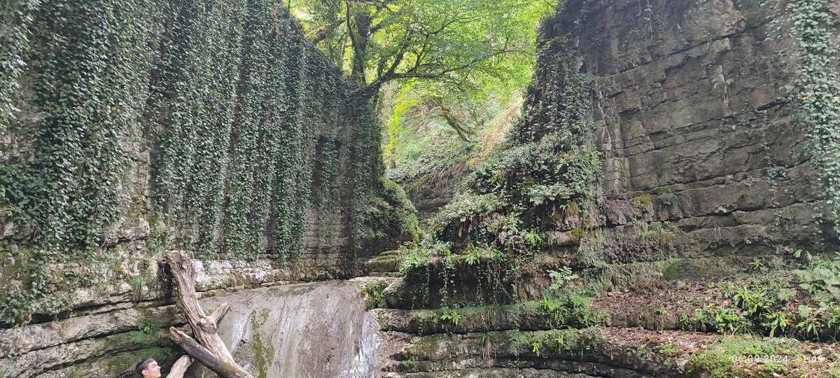 Водопад Черепаха в Абхазии. Осенью 2024 мы небольшой группой решили самостоятельно посетить Зеленый каньон,который находится недалеко от Нового Афона,на реке Мсракуара. Именно здесь находится водопад Черепаха. Он совсем небольшой,и каскад воды можно увидеть только после дождей,НО! после дождя туда не пройти. Перед спуском в каньон нас встречает уже такая красота! Шли мы по ущелью совсем не далеко,метров 300 наверное. По дороге наткнулись вот на такое...Отпечаток аммонита. Аммониты, или аммоноидеи, — подкласс вымерших головоногих моллюсков, существовавших с девона по палеоген. Своё название аммониты получили в честь древнеегипетского божества Амона, иногда изображавшегося с рогами барана. Сказочная красота вокруг! Ну и неожиданно вышли к водопаду Черепаха,который мы изначально спутали с другим,тем,что сразу у лестницы: Но настоящий открылся нам позже: Налюбовавшись красотами каньона,мы двинулись дальше,к разрушенному храму св.Георгия: Кто-то не верил,что мы нашли водопад Черепаха,н