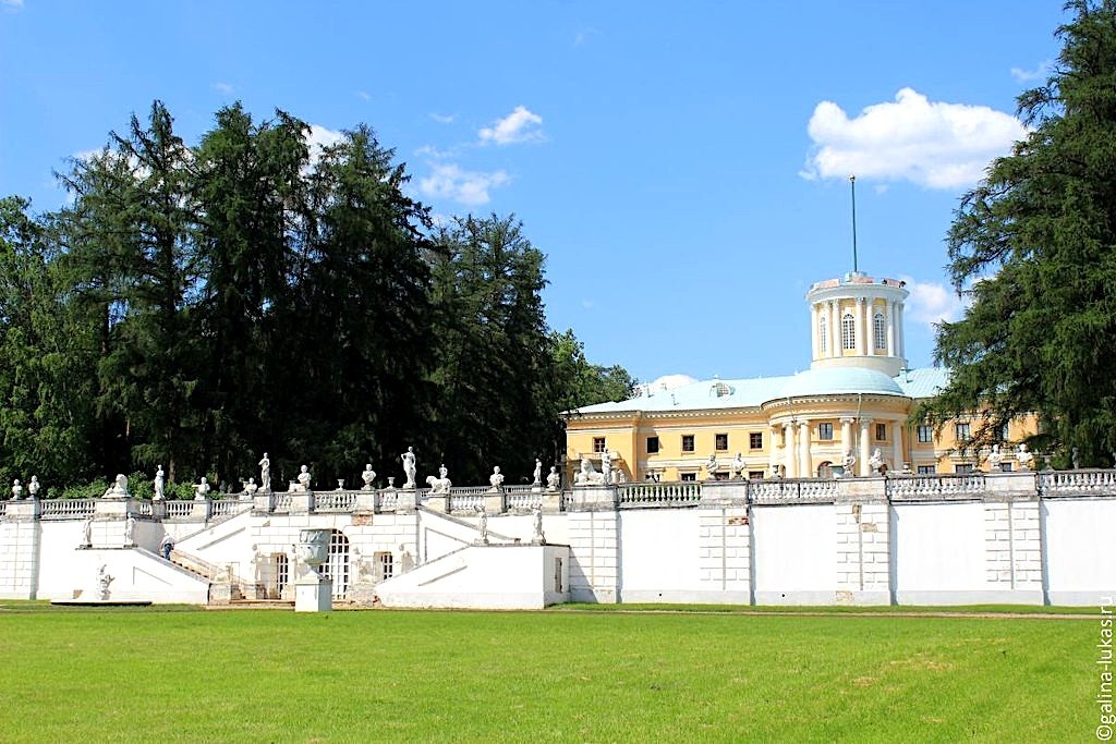 Одним июньским днём отправились мы всей семьёй и с друзьями путешествовать по западу Подмосковья, в Захарово и Большие Вязёмы. Погода была ясная, жаркая. Температура под 30 градусов. Первым делом заехали в усадьбу Архангельское
