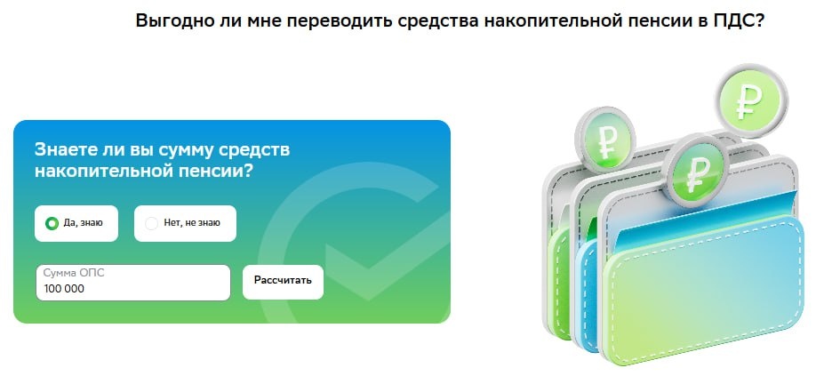 СБЕР НПФ не может ничего рассчитать, только расскажет о твоих возможностях. На сайте есть калькулятор выгоды перевода своей накопительной пенсии в Программу Долгосрочных Сбережений (ПДС), но при нажатии на кнопку Рассчитать ничего не считается - просто появляется окошко с описанием твоих возможностей))