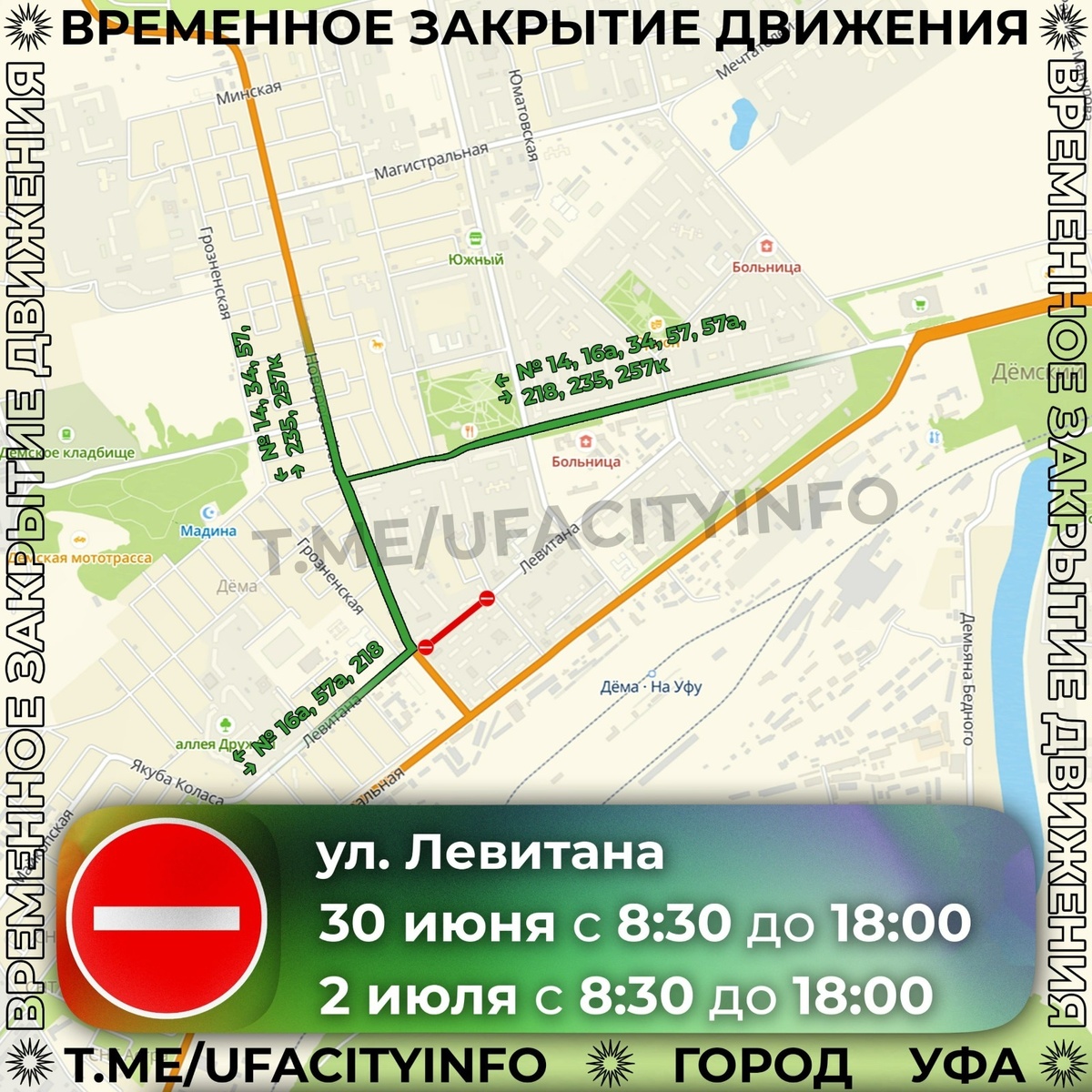 В Демском районе Уфы 30 июня и 2 июля с 8:30 до 18:00 часов на ул. Левитана — от ул. Мусы Джалиля до Новороссийской будет закрыто движение транспорта для проведения работ по кронированию деревьев. Об этом сообщили в пресс-службе мэрии. «Схема движения маршрутов общественного транспорта изменится. Пожалуйста, планируйте поездки заранее», — говорится в сообщении муниципалитета. Ранее администрация Уфы сообщила о внесении изменений в график перекрытия дорог во время празднования Дня молодёжи.