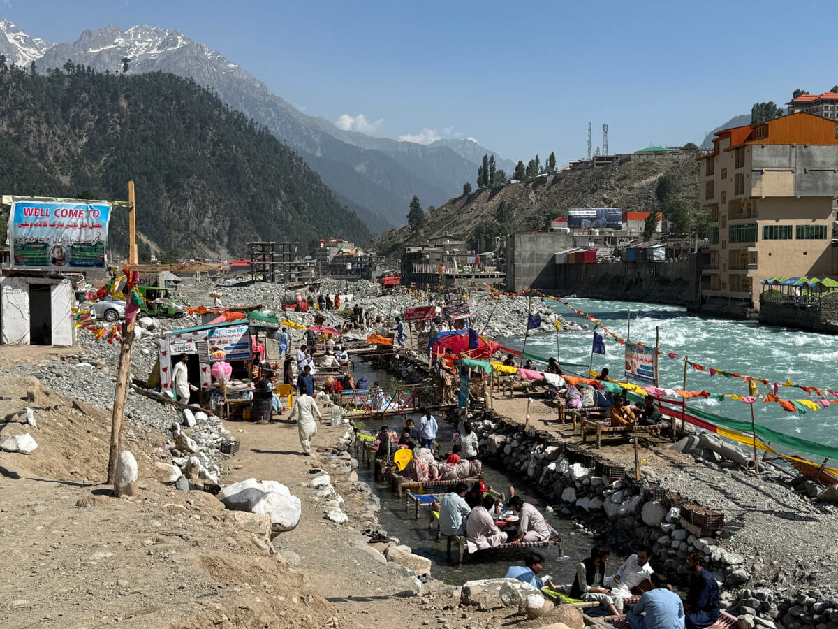 Пакистан - это совсем не та страна, которая ассоциируется с курортным отдыхом. Иностранцы не ездят сюда отдыхать на курортах, единственное, наверное, курьезное исключение - жители Афганистана, потому что у них всё еще хуже. Осмотрел высокогорный курорт Калам - он находится на 2000 м над уровнем моря, в горах, и отдыхающие тут - пакистанцы из Исламабада и других городов северной равнинной части страны, которые приезжают сюда, чтобы немножко отдохнуть от изнуряющей жары - в горах ведь прохладно. Купаться тут не особо принято, загорать - тем более, алкоголь они не пьют, так как же отдыхают на курорте пакистанцы? Первое и главное - сидят в кафе. Самый шик в Каламе - это топчаны, дастарханы, установленные прямо на дне горного ручья. Пить и есть прямо на воде в этой засушливой стране - особый шик. А еще в городской черте - сосновый лес, приятная тень. В лесу разбиты большие палатки для отдыха, также имеются кафе, и даже играют уличные (вернее, лесные) музыканты - редкость для этих мест.