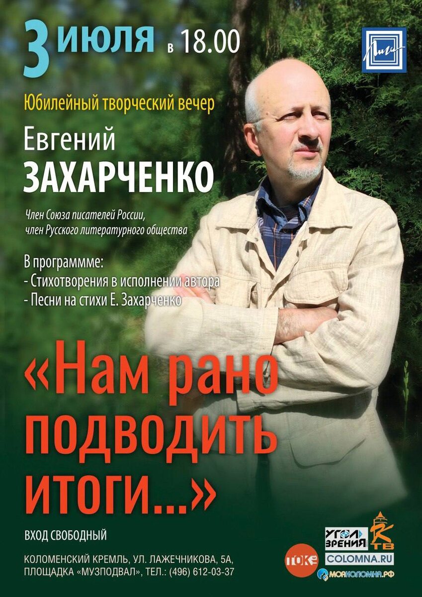 3 июля в 18:00 в арт-галерее "Лига" пройдёт юбилейный творческий вечер члена Союза писателей России, члена Русского литературного общества Евгения Захарченко.