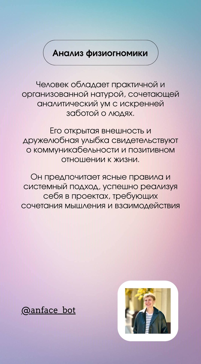 Сын-выпускник сегодня сказал эту поговорку. Первый раз слышу - но мы работаем сегодня. И в первый раз сегодня решилась и загрузила три свои фотографии в бот, в ответ получила характеристику по внешности. Достаточно длинное описание. Не знаю что сказать и как мне это отзывается, пока не поняла до конца. Сюда выкладываю короткое описание... Интересно вообще ваше отношении к растущим как грибы ботам, таким супер-пупер ИИ-технологиям, ну и к описаниям меня - для тех кто знает. P.S. Глядишь и ИИ сможет безошибочно определять соционический тип человека и … развивать соционику…