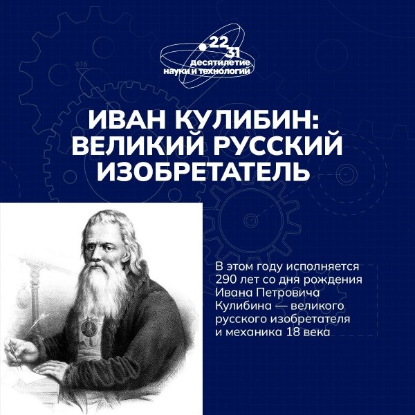 В нашей стране в последнюю субботу июня отмечают День изобретателя. Вспомним Ивана Кулибина, одного из соотечественников-изобретателей, чье имя стало нарицательным. От уникальных карманных часов до астрономических и навигационных приборов и инструментов, проекта одноарочного моста, речного судна с вододействующим двигателем, фонаря-прожектора с параболическим отражателем, «самобеглой» повозки и «механических ног». Своими изобретениями он опередил свое время Иван Кулибин, которого прозвали «нижегородским Архимедом». В наших карточках чем запомнился выдающийся механик и его главные изобретения. #десятилетиенауки Источник https://uchaly102.ru/?p=89490