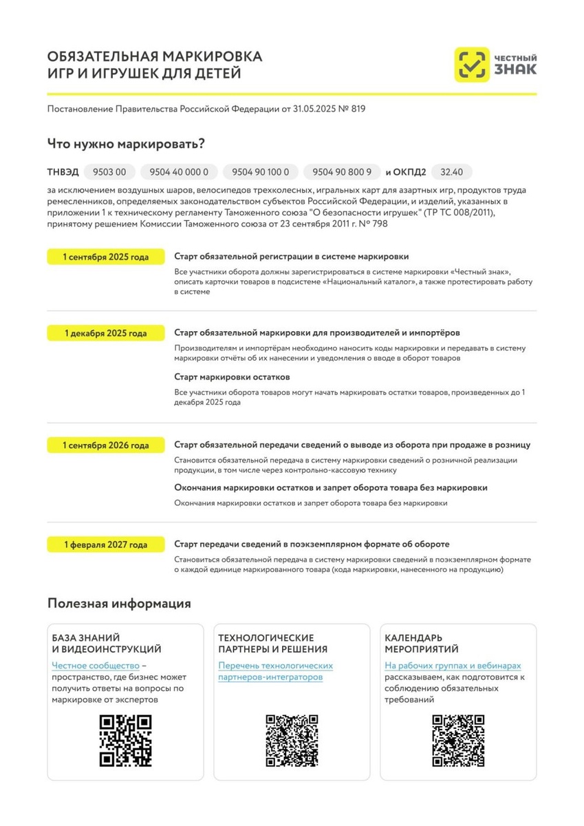 C 1 сентября все игры и игрушки для детей должны быть промаркированы в системе «Честный ЗНАК». Это касается как российских, так и импортных товаров. Какие товары подлежат маркировке? Все виды игрушек (мягкие, пластиковые, деревянные и др.) Настольные и развивающие игры Конструкторы, куклы, машинки, пазлы и т. д. Что нужно сделать? 1 Зарегистрироваться в системе «Честный ЗНАК» (если еще не сделали). 2 Получить в системе коды маркировки для каждого товара. 3 Нанести коды DataMatrix на упаковку или этикетку. 4 Передавать данные о продажах в систему. Важно! Если товар не будет промаркирован, его нельзя будет легально продавать. Сроки: С 1 сентября 2025 маркировка обязательна для всех новых поставок. До 1 марта 2026 можно продавать остатки без маркировки (но только если товар произведен или ввезен до 1 сентября 2025). Что делать прямо сейчас? Проверить ассортимент и понять, какие товары подпадают под маркировку. Зарегистрироваться в… https://uchaly102.ru/?p=89501