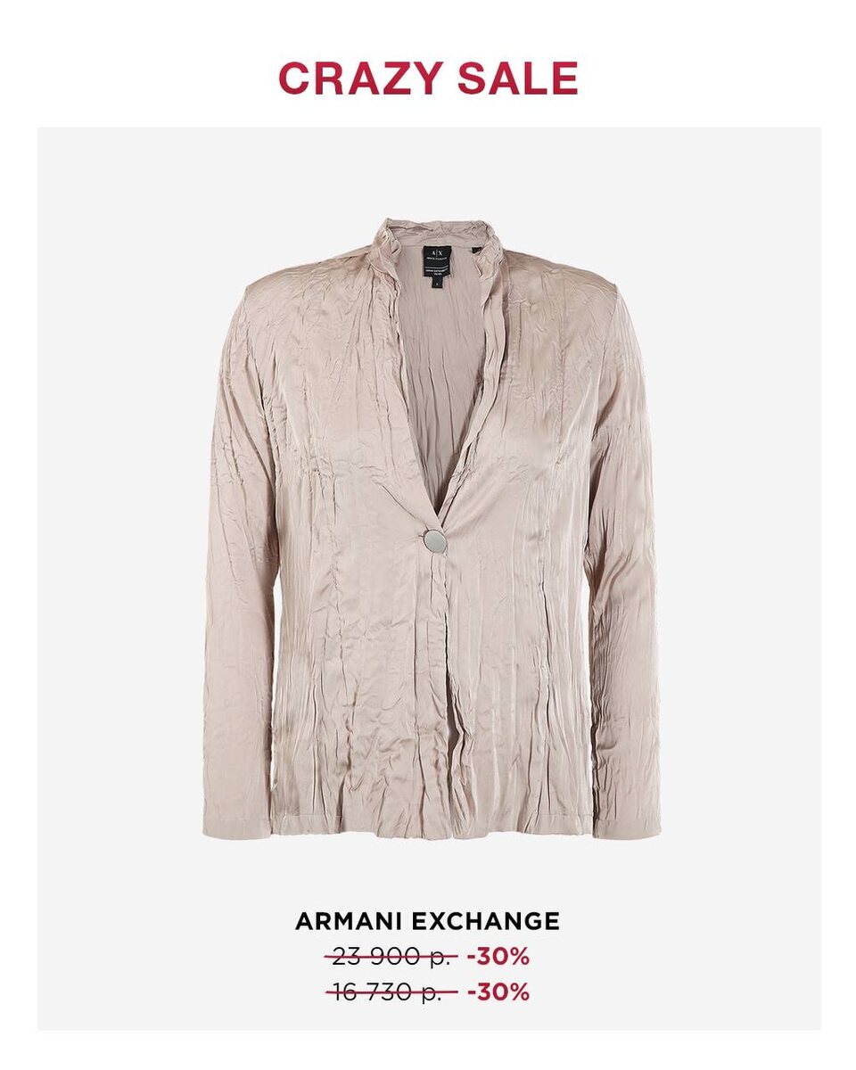 Что купить на CRAZY SALE? Собрали для вас подборку лучших позиций из коллекции Armani Exchange и EMPORIO ARMAN: Товары со скидкой до -70% + 30% на CRAZY SALE: Жакет, 11.709₽ Брелок, 2.555₽ Брюки, 16.240₽ Сумка, 19.695₽ Плащ, 17.050₽ Туфли, 21.627₽ Дополнительная скидка 30% к SALE до 70% по промокоду CRAZY только на BABOCHKA.RU Для заказа и консультации: @babochka_support_bot