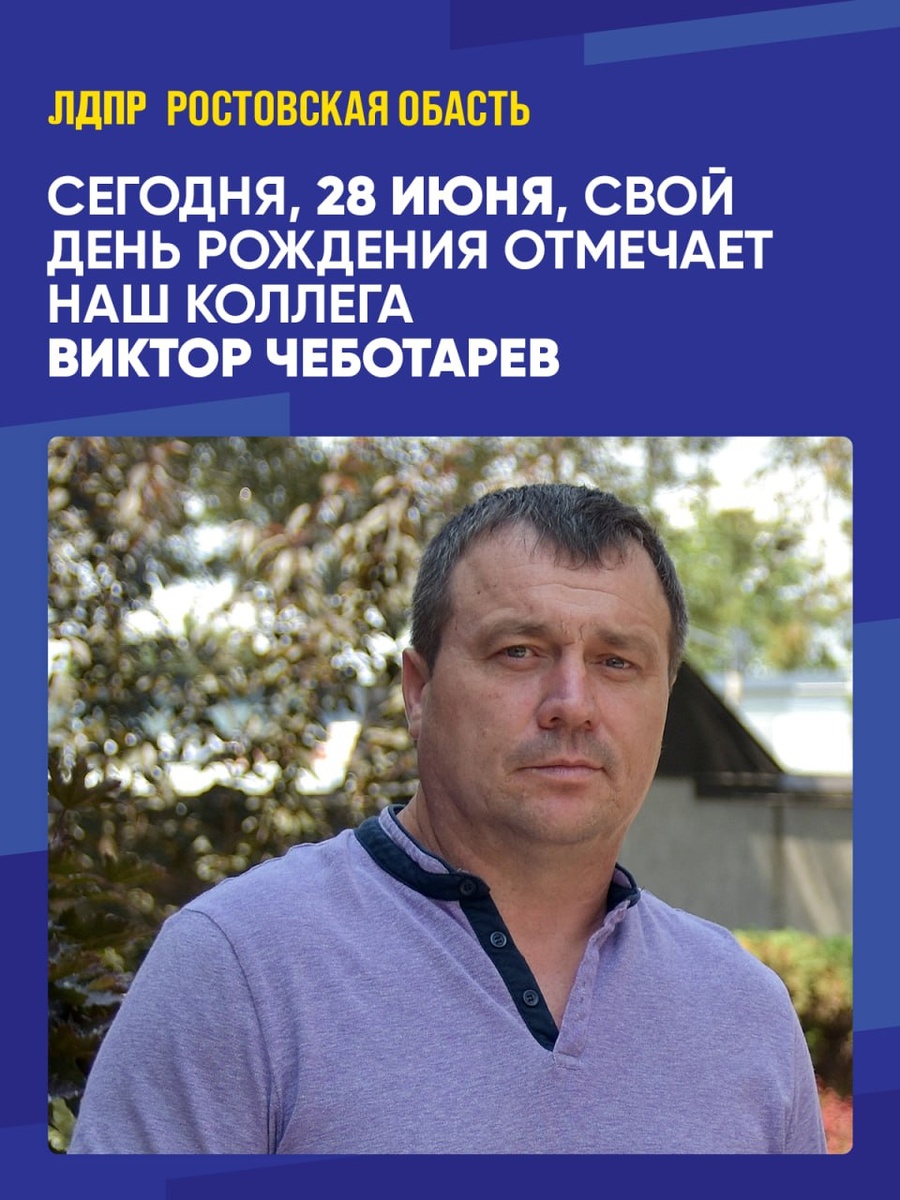 С Днём Рождения! 💠 Сегодня свой день рождения отмечает наш коллега и товарищ Виктор Чеботарев — человек, чья энергия и преданность делу вдохновляют всех вокруг. Виктор Чеботарёв — человек, который с полной отдачей помогает благоустраивать территорию села Кривянское и занимается важнейшей и очень нужной деятельностью. Под руководством Виктора Чеботарёва реализуются проекты по созданию комфортной и безопасной среды для жителей, а также успешно проводится иппотерапия, которая помогает десяткам людей с разными возможностями. 💠 Кроме того, он активно поддерживает защитников Отечества, выполняющих задачи в зоне специальной военной операции. Его вклад отмечен благодарственным письмом командира 188-го отдельного Краснознаменного батальона охраны и обеспечения войск Национальной гвардии. ✨✨✨ Ростовское региональное отделение ЛДПР поздравляет Виктора с праздником! Желаем крепкого здоровья, неиссякаемого оптимизма, новых достижений в благородном деле помощи людям и, конечно, личного счасть