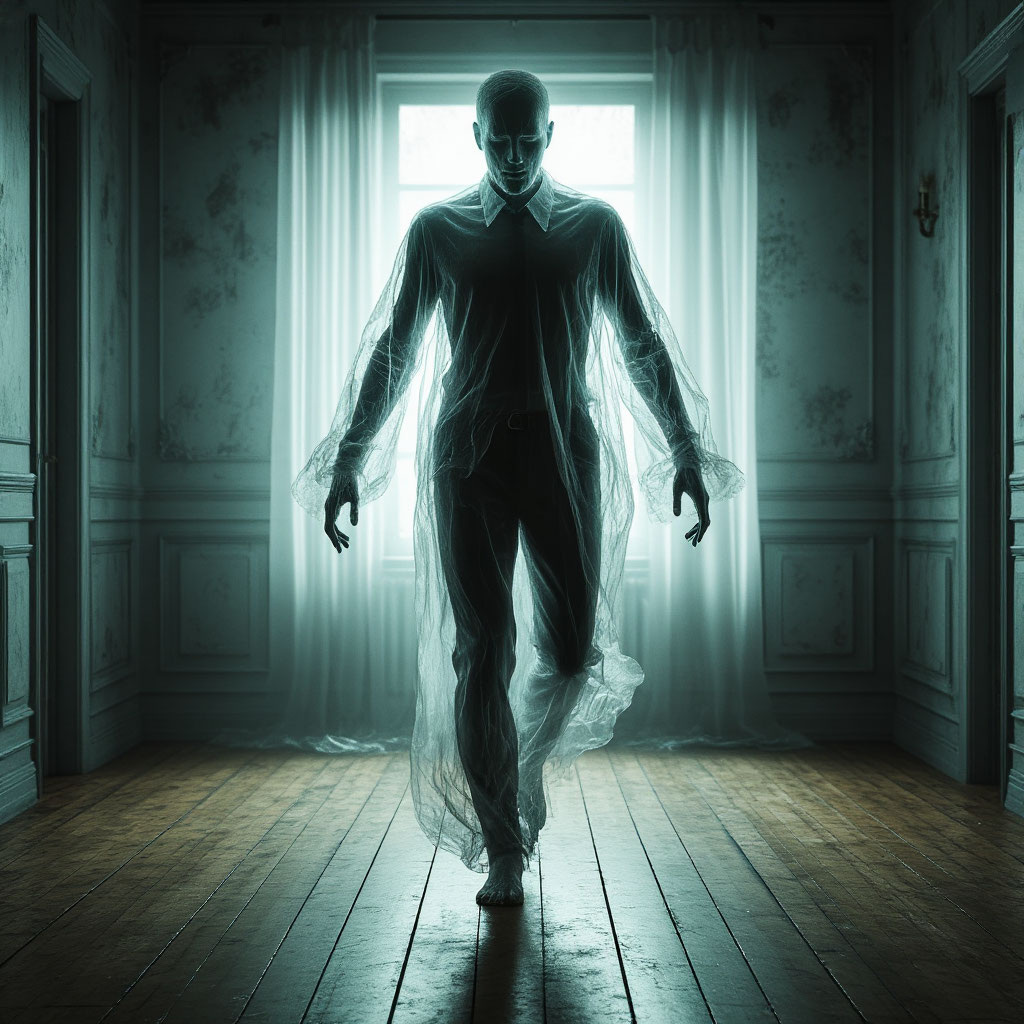 Призрак был молочного оттенка. Ног у страдальца уже не было, он парил над землей, едва заметно покачиваясь.
