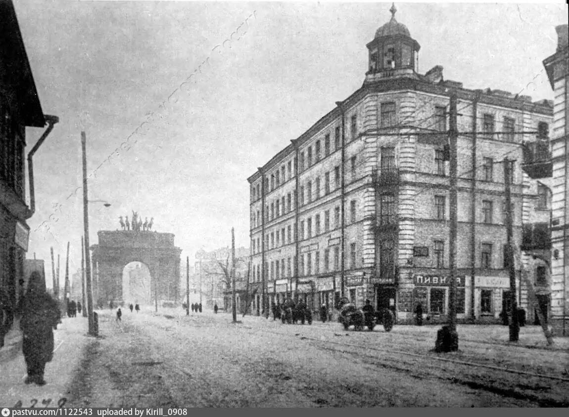 Доходный дом семьи Гордзялковских в Петербурге был построен в 1905 году и выделялся круглой башенкой на углу. На брандмауэре дома в 1965 году появилось монументальное панно, созданное как дипломная работа студентом Рифкатом Багаутдиновым под руководством профессоров художественно-промышленного училища имени Мухиной — К. Л. Иогансена и Г. А. Савинова. Панно изображает революционные эпизоды, связанные с Нарвской заставой: заседания рабочих кружков, штурм Зимнего дворца, Александровскую колонну. Центральный образ — рабочий с лозунгом: «Пролетарии всех стран, соединяйтесь!» Но что же было здесь до 1965 года? В 1933 году на стене разместили композицию «Выше знамя соцсоревнования и ударничества» с именами передовиков производства. В 1934 году она мутировало в «Знамя ВКП(б)» с четырьмя заповедями коммунистов (фото 5-6). В 1935 году её сменил портрет Иосифа Джугашвили — первая версия, включавшая свежую цитату с XVII съезда ВКП(б) 1934 года. Предположительно в 1938 году портрет был перерис