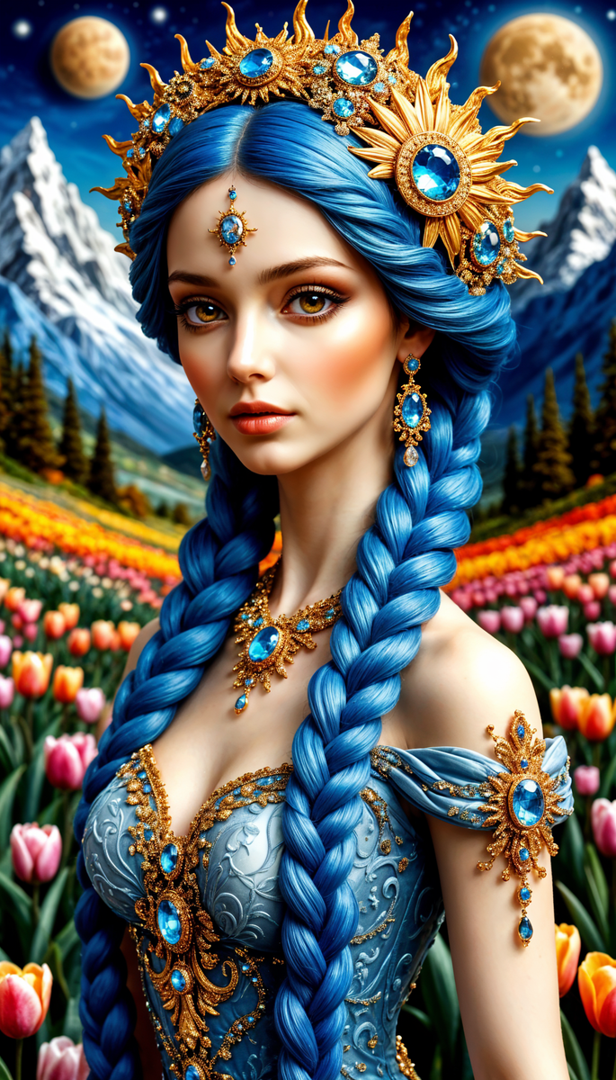 Грациозная Дива фарфоровой красоты, выразительные карие глаза, длинные густые нежно-голубые косы, украшенные мотивами солнца и луны, самоцветами, в изящном дорогом платье. Причудливые пейзажи с горами, реками, полями тюльпанов. Работа сочетает рельефные элементы: фарфор, пластилин, бисер и различные драгоценные камни. Декоративные завитки и сложные детали создают волшебную, неземную атмосферу, 3d рендер P.S. Приглашение на Мастер-Классы по изучению Топовых Нейросетей, где Вас ждут Бонусы и Подарки: <<<Участвовать Бесплатно>>>