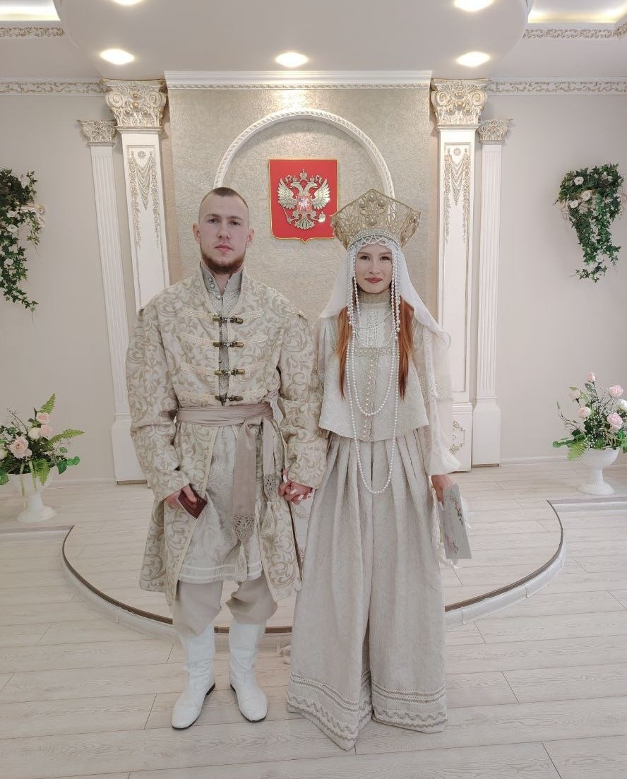 Молодожены Анатолий и Галина из Черновского района пришли на регистрацию брака в костюмах в старорусском стиле. Девушка рассказала, что ее подруга шьет наряды, поэтому им захотелось выглядеть необычно.