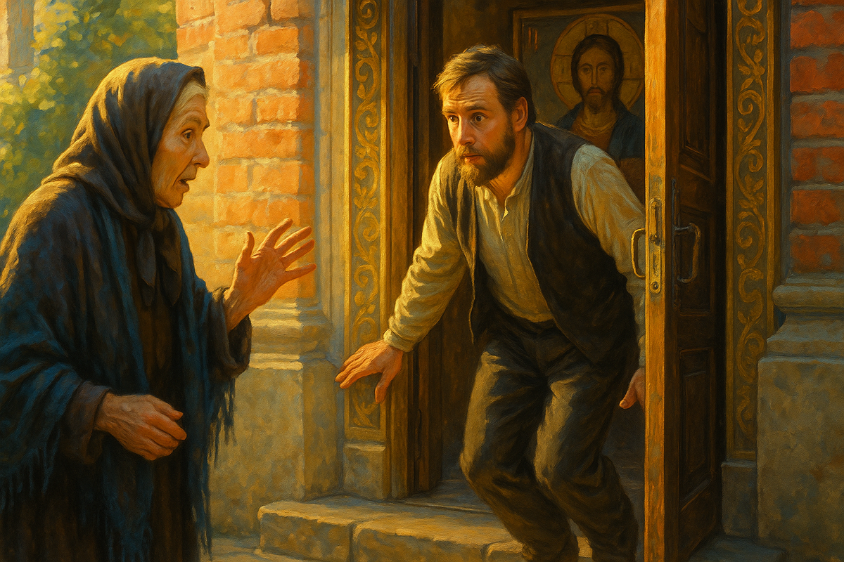 Ну что, милые мои, расскажу я вам историю одну, что со мной приключилась. Сядьте-ка поближе, да послушайте. Шла я как-то в церковь нашу, подхожу к дверям храмовым, а тут — бац! — чуть не сшиб меня мужичок какой-то. Гляжу я — а он задом пятится из церкви, словно рак речной! Едва увернулась я. «Ты что ж это, милок, творишь-то?» — спрашиваю. А он мне, бедолага, с таким благоговением в глазах отвечает: «Как что? Правильно из храма выхожу! Меня тут одна богомольная старушка научила — грех, говорит, великий спиной к иконам поворачиваться! Вот я уже третий год так и делаю. Только вот беда — другие-то люди не знают этого правила святого, всё грешат да грешат, спиной к святыням поворачиваются!» Ахнула я тогда. Стоит передо мной человек, искренне верит, что праведное дело творит, а сам-то, горемыка, беду на свою голову накликает! Ходит задом наперёд уже который год! Страшное дело скажу я вам — это ж самая настоящая порча, только своими руками сделанная! Сами себе люди беду на голову накликают, с