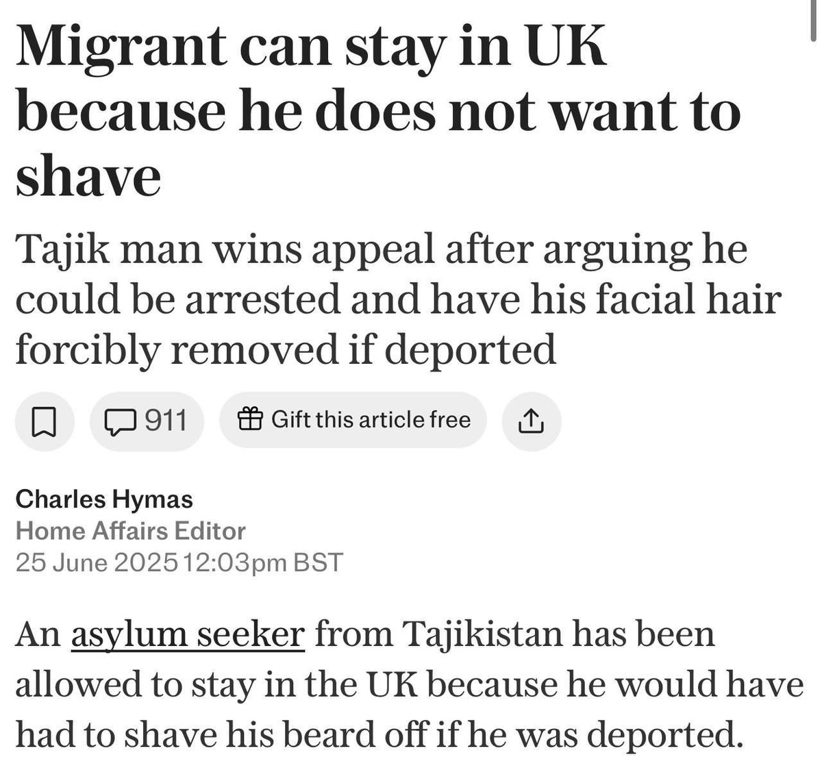 Таджика не стали депортировать из Британии, так как на родине его могут заставить сбрить бороду МВД Великобритании пыталось депортировать гражданина Таджикистана обратно на родину, но суд по вопросам предоставления убежища постановил, что он может иметь право на международную защиту в Великобритании из-за своей бороды В Таджикистане бороды неофициально запрещены правительством. Как сообщается, граждан страны арестовывают и насильно бреют, именно этим и прикрылся таджик, дабы избежать депортации Tadschike entgeht Abschiebung aus Großbritannien, weil er in seinem Heimatland zum Bartrasieren gezwungen werden könnte. Das britische Innenministerium versuchte, einen Tadschiken in sein Heimatland abzuschieben. Ein Asylgericht entschied jedoch, dass er aufgrund seines Bartes Anspruch auf internationalen Schutz in Großbritannien haben könnte. Bärte sind in Tadschikistan inoffiziell verboten. Berichten zufolge werden Bürger verhaftet und zwangsrasiert. Dies nutzte der Tadschike, um einer Ab