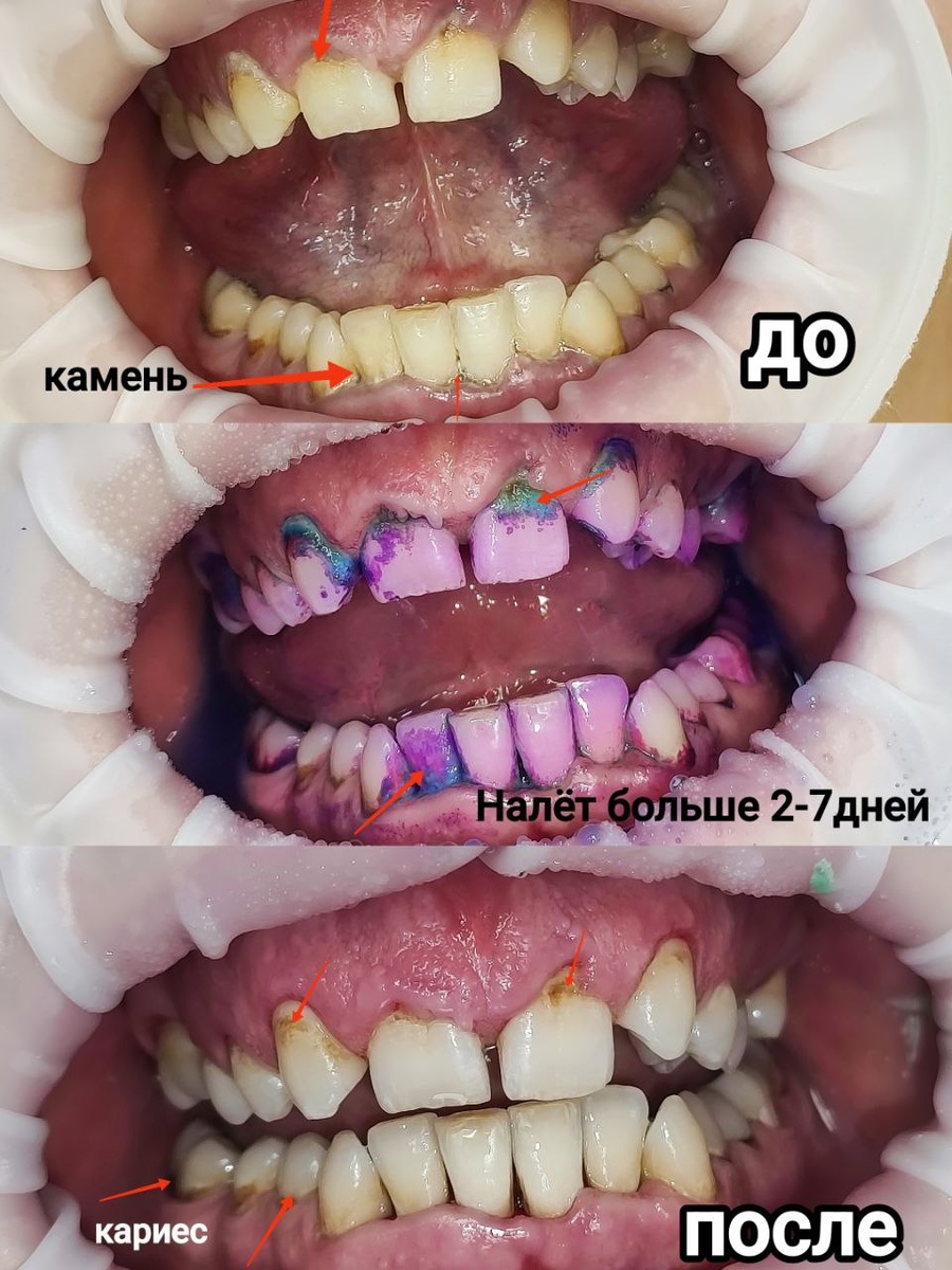 Пациент пришёл первый раз в жизни на профессиональную гигиену. На фото «до» видно всё, что обычно скрывается за словами «у меня всё в порядке, иногда, что-то кровоточит»: 〰️плотный налёт, который не уберёт ни одна щётка 〰️кариес и очаги деминерализации под налетом, которые появились из-за плохой гигиены 〰️воспаление десны 〰️ и самое тревожное — оголение корней зубов, сигнал о начале убыли костной ткани. И это не только про красоту улыбки! Это про здоровье ваших зубов и десен. Что я сделала для пациента? 🔵фотопротокол 🔵индикация налёта 🔵инфоримирования пациента, где у него есть проблемы с зубами 🔵сняли мягкий и пигментированный налёт с помощью Air-flow; 🔵сняли зубные отложения(над и под десной) с помощью ультразвука; 🔵 отполировали зубы щеткой/резинкой и пастой 🔵полировка между зубами штрипсой, контроль зубной нитью 🔵провели реминерализацию и противовоспалительную терапию для десен 🔵даны рекомендации по уходу и лечению дома. 🔵контрольный визит, через неделю, а затем, че