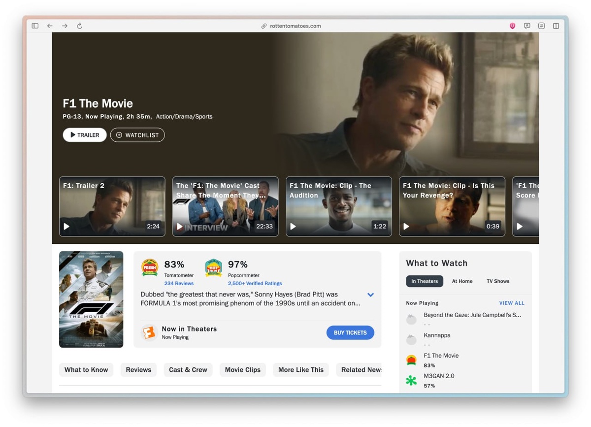 Фильм о Формуле-1 с Брэдом Питтом вызывает бурю эмоций и фурор в мире кино. Сразу после релиза он заработал впечатляющие 83% свежести на Rotten Tomatoes и 97% положительных оценок от зрителей. Зрители отмечают великолепную постановку гонок и харизму главного героя, что делает просмотр на большом экране обязательным. Если вы хотите узнать, что об этом фильме говорят критики и зрители, можно ознакомиться с рейтингом по ссылке. В России премьера фильма состоится уже 5 июля. Ждем с нетерпением! Наш уютный канальчик 🤖 Анимация | СhatGPT-4 | Помощь с резюме