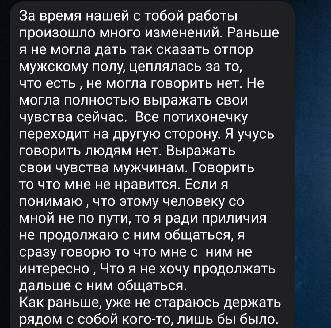 Безусловно, с себя! Всего за 4 онлайн встречи ( 1 раз в неделю ) Таня научилась: И это именно те самые изменения, которые в совсем скором времени приведут Таню к началу серьезных и счастливых отношений. Хочешь также? Пиши прямо сейчас мне в личные сообщения по ссылке и я забронирую дату и время для первичной бесплатной встречи. Я знаю, как помочь тебе избавиться от любовных неудач.