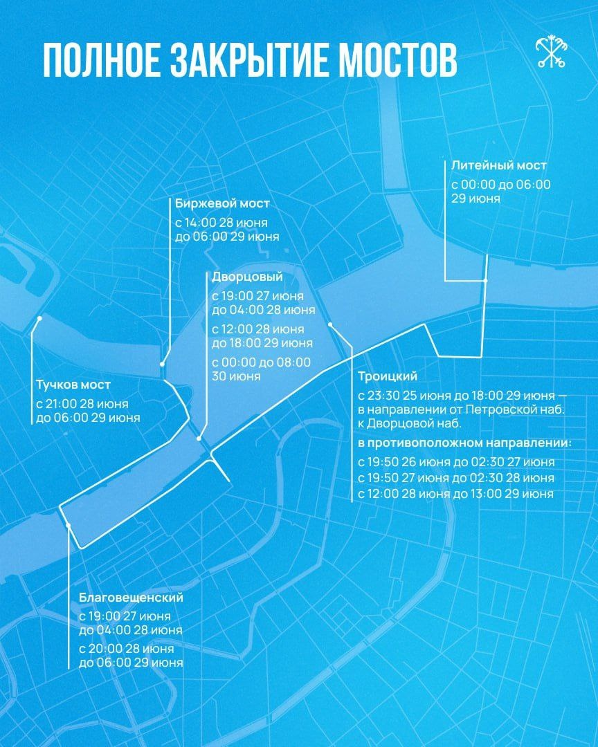 В центре города будут полностью перекрыты мосты во время праздника «Алые паруса» В связи с подготовкой и проведением мероприятия в городе полностью перекроют движение по мостам: Дворцовому, Троицкому, Благовещенскому, Литейному, Биржевому, Тучкову. Будьте внимательны и заранее планируйте свой маршрут. Все ограничения собраны в этом посте. 🙌 Пресс-сек Красногвардейского