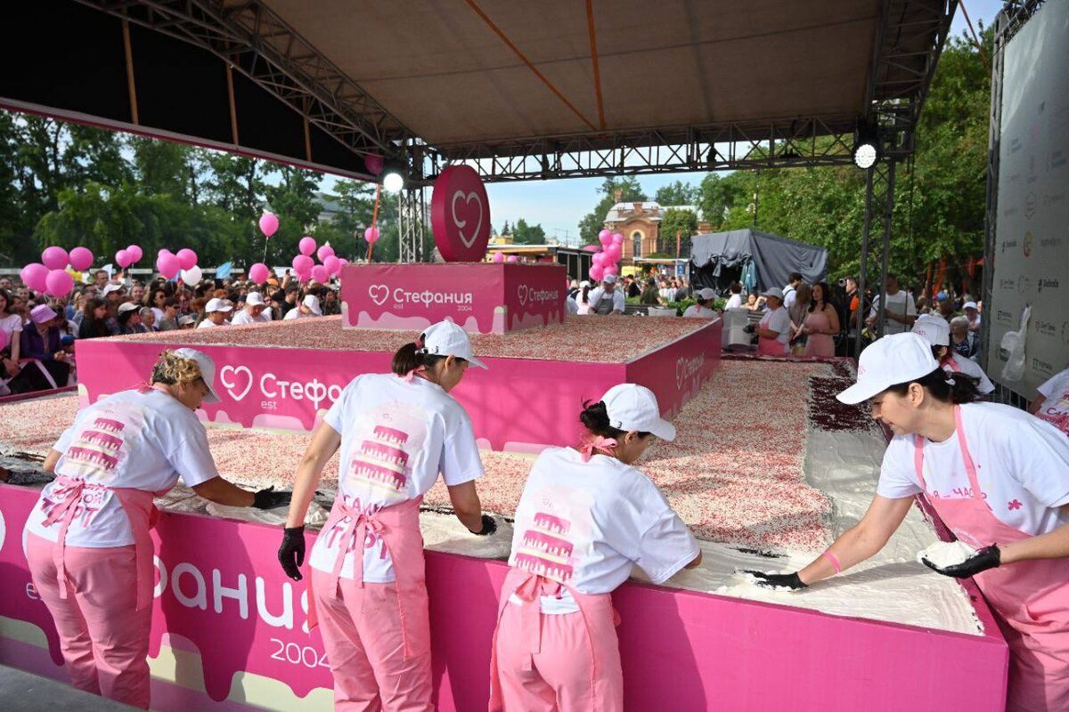 Сегодня «Стефания» за шесть часов изготовила трехъярусный торт «Брауни» с брусникой общей площадью 36 квадратных метров.