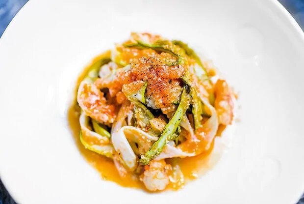 2.С побегов спаржи срезать грубую кожицу с помощью овощечистки, нарезать их вдоль тонкими полосками вроде тальятелле. Тушить примерно две минуты, пока они не станут чуть мягче, и переложить на тарелку.