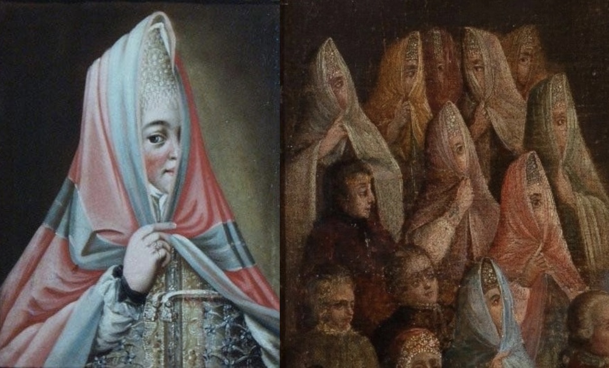 В нашем воображении паранджа — это что-то далёкое, восточное, чужое. Мы привыкли думать: «У нас-то так не было!» А между тем, если перенестись в русскую глубинку XVIII века, можно наткнуться на обычай не менее удивительный. На старинных картинах из Тверской губернии девушки запечатлены с платками на лицах, выглядывающие буквально одним глазом. Выглядит диковинно, почти жутковато. Но это не фантазия художника — а вполне реальная традиция Торопца, старого русского города. До великих реформ Петра жизнь русской женщины была почти невидимой. Девушка подчинялась отцу, жена — мужу. Выходить одной на улицу считалось предосудительным. Даже разговор с чужаком — уже почти позор. В церкви строгий порядок: голова покрыта, взгляд опущен, рукава длинные. В некоторых местах это доходило до настоящего ритуала скромности. Например, женщина должна была прикрывать лицо тканью или рукой при разговоре с чужим мужчиной. Платок не просто согревал — он заявлял: «Я — замужняя». А вот венец на голове говорил:
