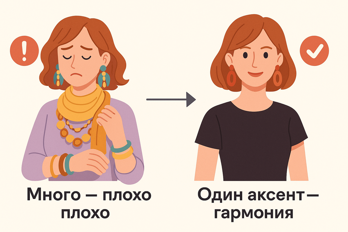 Работает принцип: либо одно яркое украшение, либо несколько мелких и скромных.