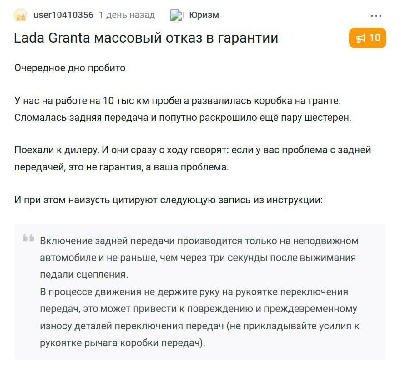 АвтоВАЗ продаёт машины с коробками, которые разваливаются через 200 км, но отказывает в гарантии Дилеры требуют по 60 тысяч за ремонт и ссылаются на «неправильную эксплуатацию». Владельцы шутят, что пора запретить ездить в дождь, потому что кузов сгниёт, и это тоже будет не гарантийный случай.