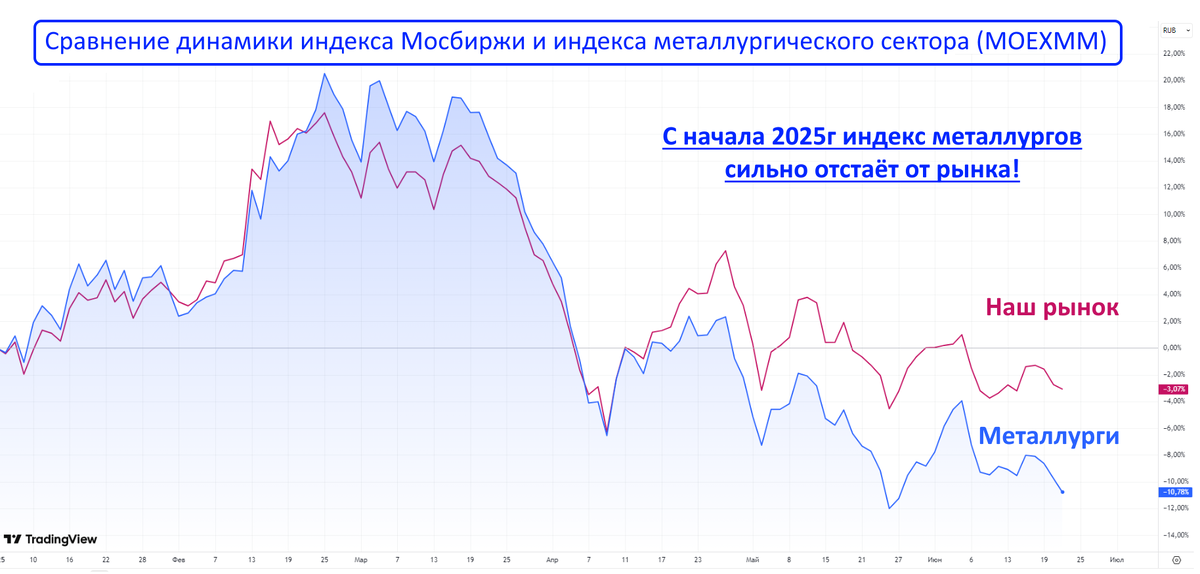 В 2025г российские металлурги переживают сложный период, находясь под давлением множества негативных факторов. С начала года сектор потерял около 10%, что значительно хуже динамики рынка (индекс МосБиржи снизился на 3%):