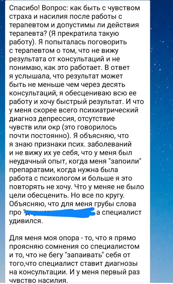 Я вам очень сопереживаю! Так быть не должно! Однажды "проработанные коллеги" удалили меня из Мастермайнда за слова о том, что нельзя обвинять клиента за его же деньги🤦♀️ 1. Психолог не врач и не ставит диагнозы, мягко высказывает гипотезы и направляет к врачу 2. После консультации должно стать легче! Даже если в процессе было больно 3. Обвинять клиента- недопустимо!!! Я всегда злюсь. Да, есть ответственность клиента, но мы затем ему и нужны, чтобы помочь 4. Спорить с клиентом и доказывать свою значимость- это некомпетентность. Ходит ли коллега на супервизии и личную терапию? Всегда сверяемся с клиентом: как вам? Предлагаем варианты, объясняем, что и зачем 5. 10 консультаций...есть такое, но может помочь и разово, а может и за год не помочь! Но ключевое- вам должно быть комфортно с психологом! Зачем платить человеку, который неприятен и не нравится, какая там терапия💔 нет никакого сопротивления! Просто люди не совпали Личность психолога играет огромную роль в процессе работы и