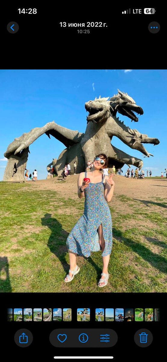 🍅Кудыкина гора: история одного помидора)🍅 Это я в 2022 году на Кудыкиной горе: стою довольная с помидором, даже не подозревая, что через 3 года в это же самое время буду уже стоять со своим помидором любимым❤️ Интересно, что многое изменилось на горе: больше нельзя погулять с ламой Винсом (зато есть ленивый верблюд Дуку, который так и не встал за все время, пока мы там были😂), сделали велосипедную дорожку и в замке все теперь для детей)) Но осталось и неизменное: покушать по-прежнему можно всего в одном месте, остались лабиринт с помидором и ангелы на горе, с которыми фоточки не очень😅 Змей-Горыныч рычит в 20)) Только теперь почему-то очень уж мало он рычит) А настоящее представление начинается после: когда все бегут к своим машинам, чтобы не встать в огромную пробку, обгоняя друг друга и создавая панику)) Поскольку я тут не первый раз, мы машину поставили максимально близко, чего и вам советую, если соберетесь сюда приехать) А наш путь лежал дальше.. #вивыходные #июньскийтри