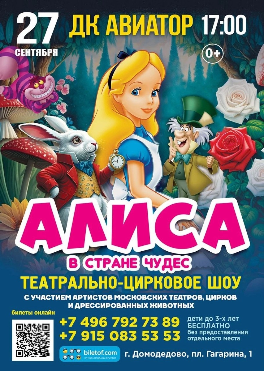 ✨ АЛИСА В СТРАНЕ ЧУДЕС Театрально-цирковое шоу, по мотивам сказки Льюиса Кэрролла "Алиса в стране чудес". Мы приглашаем Вас, вернуться вместе с Алисой в страну чудес! Проводником в волшебную страну станет Безумный Шляпник, который сможет удивить Вас невероятными трюками с чайными кружками и своим сумасшедшим чувством юмора. Его волшебная шляпа прочитает мысли самых смелых. Алиса порадует зрителей гигантскими мыльными пузырями и завораживающим световым шоу. В программе принимают участие артисты Московских театров, цирков и дрессированные животные. 🚫 Возраст: 0+ 📆 27.09.2025🕒17:00 🏢 Городской дом культуры «Авиатор» 📍 г. Домодедово, ул.Гагарина, д.1 🎫 Купить билет: https://new.biletof.com/choose/?ra=16395&elem=0&var=2&frame=1 ✅ Мероприятия Домодедово https://dzen.ru/id/66f10385cc4c5a16f7b5fb02 http://vk.com/domodedovo_events http://dzen.ru/domodedovo_events