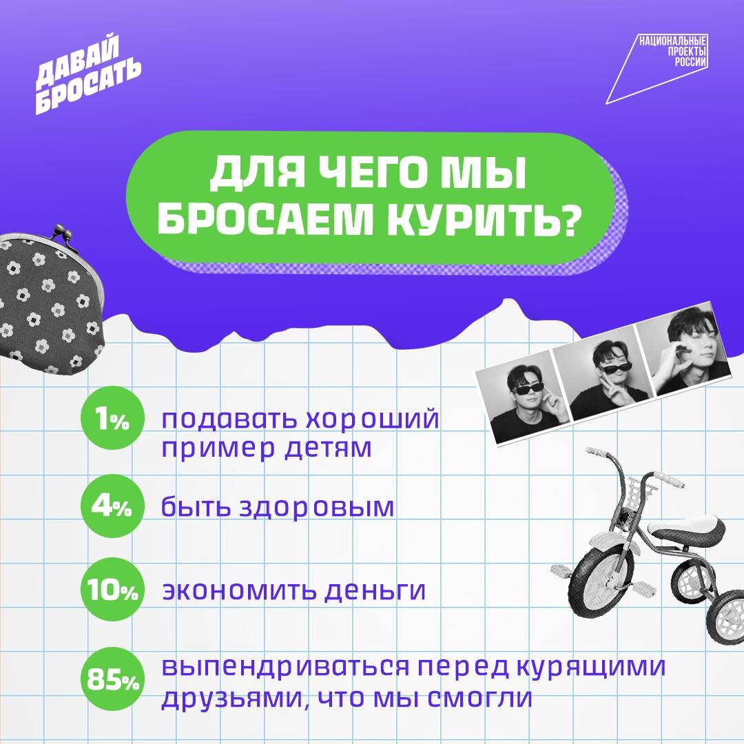 Выбирай, в какой процент входит твоя причина бросить 😂 И ставь реакцию, если: 👀 — подаёшь хороший пример 😄 — теперь здоров ❤️ — наконец-то накопил 🙈 — шутишь над курящими друзьями #минута_юмора