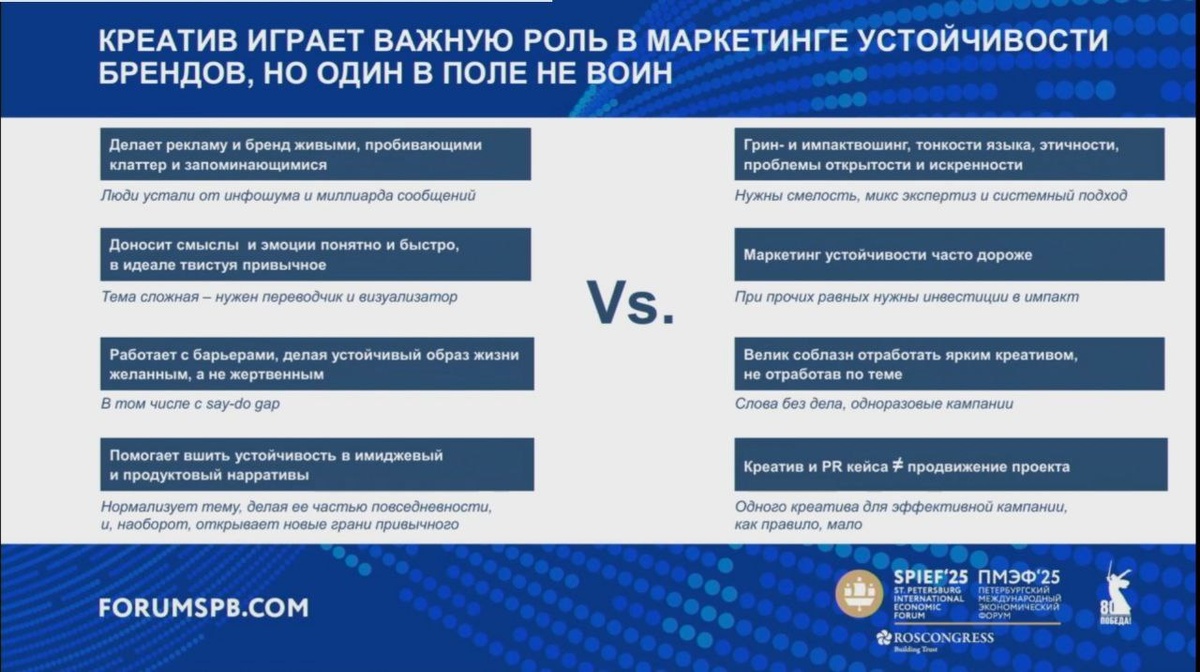 Креатив как суперсила ESG-коммуникаций: почему за красивыми словами должны стоять реальные дела Сегодня бизнес всё чаще слышит: «Покажите реальные дела, а не просто красивые слова!» Запрос общества на устойчивые практики становится всё громче, и компании отвечают на него, инвестируя в честные и понятные коммуникации. На площадке ПМЭФ-2025 эта тенденция была особенно заметна: множество сессий было посвящено тому, как важно говорить о смыслах, уметь рассказывать об устойчивости и вплетать её в каждую бизнес-историю. 📚 Креатив — суперсила в мире устойчивости В условиях информационного шума креатив становится настоящей суперсилой. Именно он помогает сделать сложные темы ESG простыми и близкими каждому, превращая сухие отчёты об устойчивости в вдохновляющие истории. Креатив — это тот самый «переводчик», который помогает бизнесу донести важные смыслы до аудитории через яркие нарративы, уникальный tone of voice и экспертную коммуникацию. 📚 Почему маркетинг устойчивости сложнее и дороже