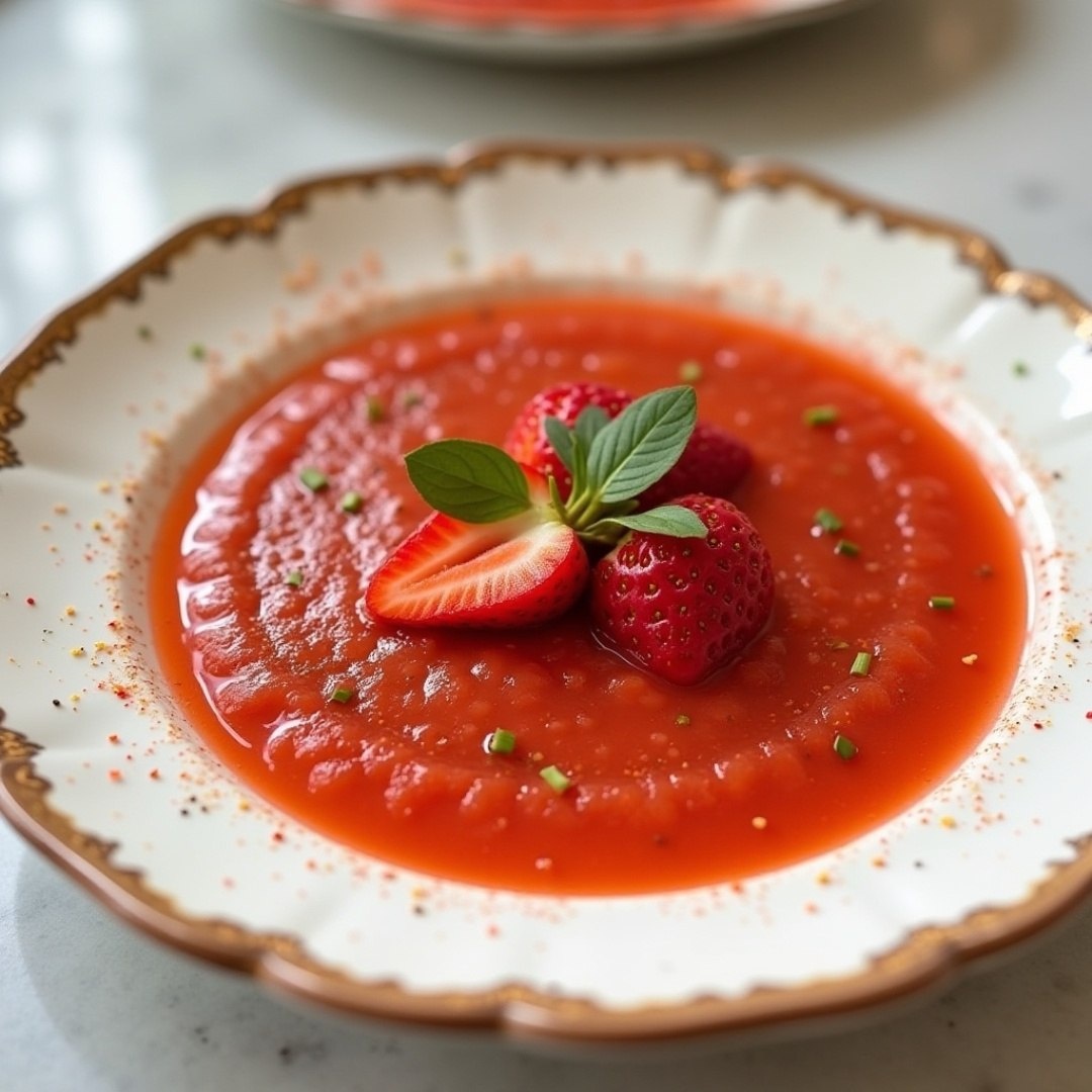 Гаспачо с клубникой Ингредиенты⤵️ 🔸Помидоры — 500 г 🔸Клубника — 200 г 🔸Огурец — 1 шт. 🔸Перец болгарский — 1 шт. 🔸Лук красный — ¼ шт. 🔸Чеснок — 1 зубчик 🔸Оливковое масло — 3 ст. л. 🔸Бальзамический уксус — 1 ст. л. 🔸Соль, перец — 1 щепотка 🔸Базилик свежий — 3 веточки Приготовление🍓 1. Овощи и клубнику вымыть. Помидоры, огурец, перец очистить от семян и нарезать. Лук и чеснок мелко порубить. 2. Сложить все ингредиенты в блендер, добавить масло, уксус, соль и перец. Измельчить до гладкости. 3. Процедить через сито, охладить 2–3 часа. 4. Подавать с рубленым базиликом или мятой. Рецепт дня #гаспачо #томатный_суп #холодный_суп #летний_суп #помидор #клубника #суп #обед