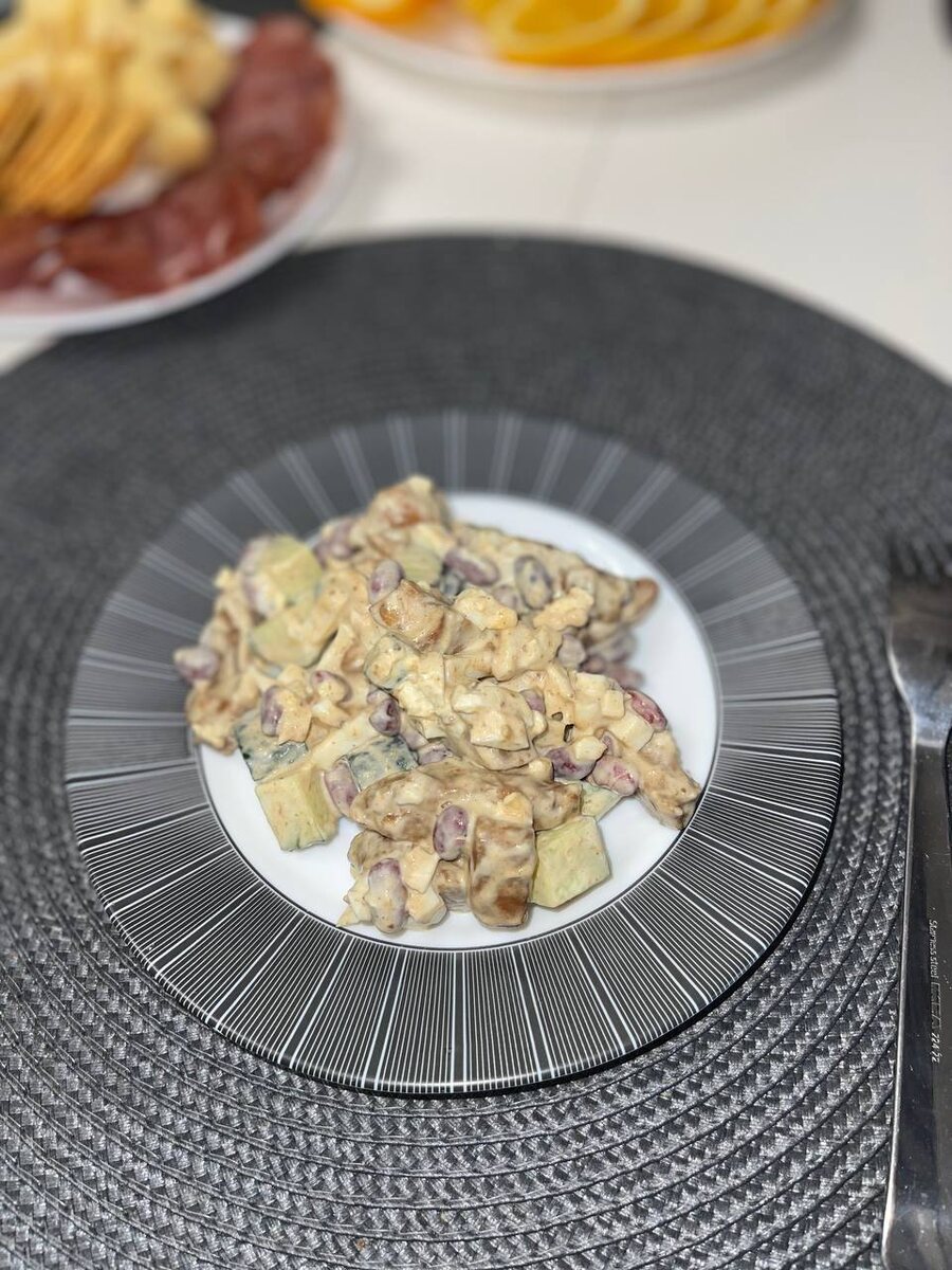 Сытный салат с фасолью Ингредиенты: Куриное филе Яйцо Фасоль красная Огурец Соевый соус Мед Сванская соль Майонез Приготовление: Куриное филе порезать брусочками, обжарить в соевом соусе с приправой и медом. Необходимо выпарить всю жидкость. Остудить. Выложить фасоль, огурец и яйцо. Смешать с майонезом или сметаной. По желанию добавить чеснок. Приятного аппетита🌺 #салат #курица #фасоль