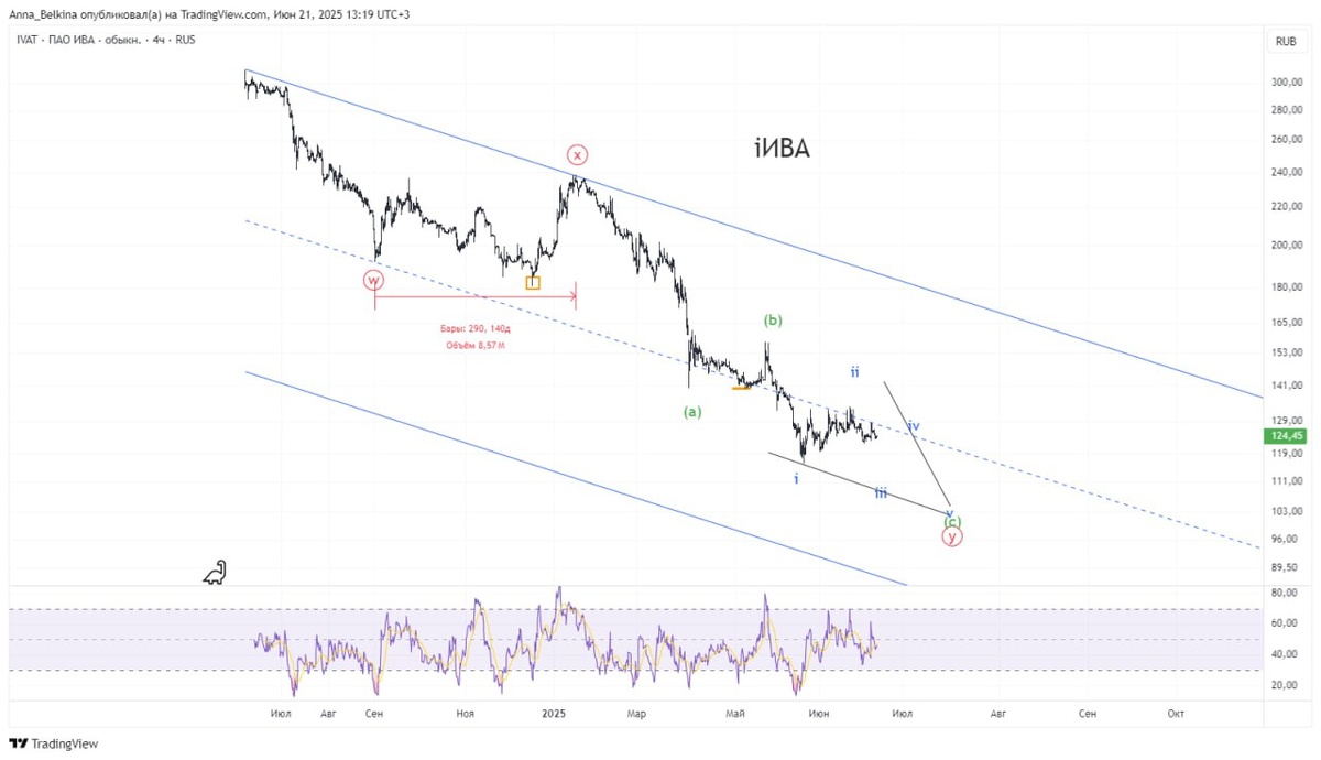 в развитии нисходящий двойной зигзаг, в котором волна (х) приняла вид бегущей (вниз) плоскости. Эта бегущая вниз структура по (х) вполне отработалась, мы увидели существенное снижение. Причем, оно не завершено, поскольку впереди в развитии еще волна (с) of [y] в виде Конечной диагонали, в которой не хватает еще 2 низов.