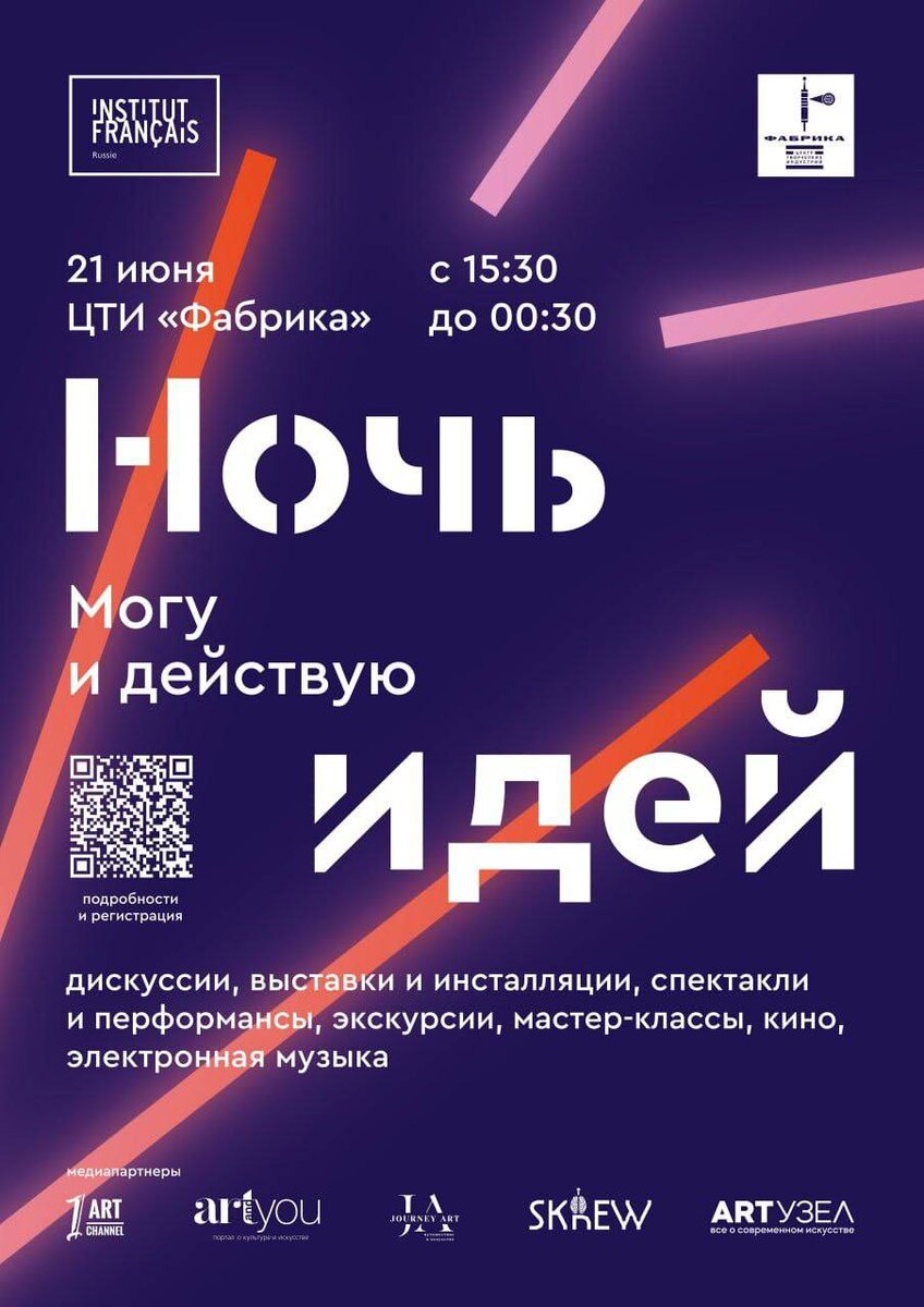 21 июня Центр творческих индустрий «Фабрика» и Французский институт в России проводят московскую версию международного фестиваля «Ночь идей 2025» на тему «Могу и действую». Это событие проходит на пяти континентах и включает лекции, спектакли, выставки и музыкальные выступления, посвященные личной и общественной ответственности, инклюзии и экологии. В программе – философ Жак Рансьер, сессии с фондом «Дом с маяком», арт-дискуссии и экологический ликбез. В кинотеатре покажут комедию «Лучше всех» и байопик «Монтессори: Воспитание любовью». С 19:00 до 00:30 на пандусе Сиреневого сквера пройдет музыкальная часть с духовым оркестром, диджей-сетами и выступлениями. 🎫 Вход свободный по регистрации 📆 21 июня с 15:30 до 00:00 📍Центр творческих индустрий «Фабрика», Переведеновский переулок, д. 18.