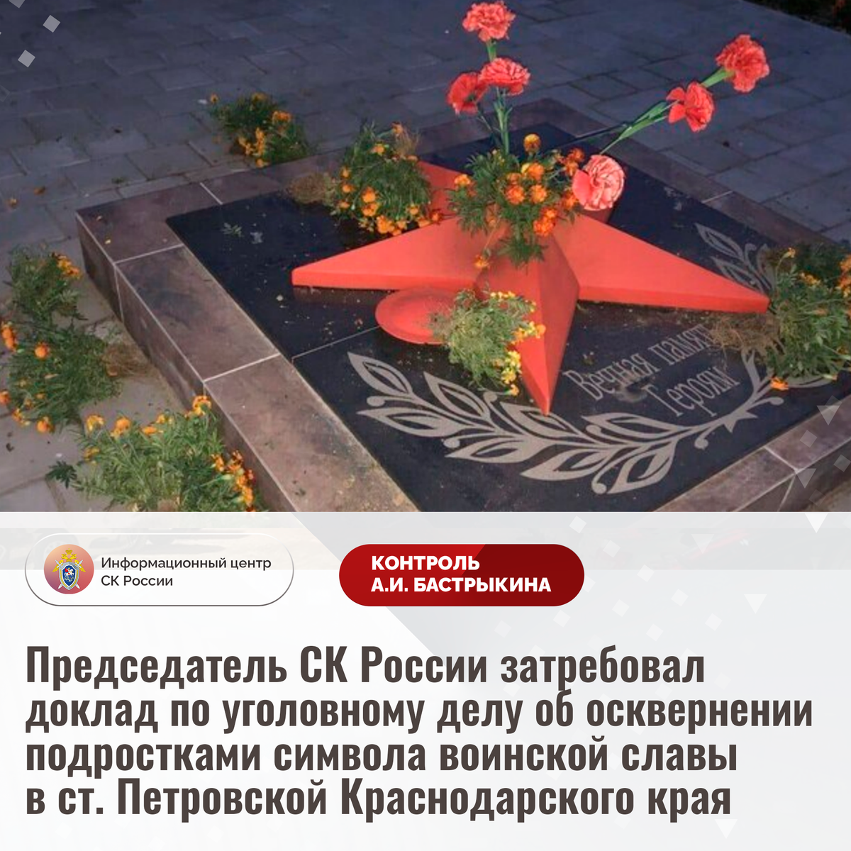 Председатель СК России затребовал доклад по уголовному делу об осквернении подростками символа воинской славы в ст. Петровской Краснодарского края В СМИ сообщается об осквернении символа памяти погибших в годы Великой Отечественной войны в станице Петровской Краснодарского края. Две школьницы, находясь у мемориала, бросили вырванные из клумбы цветы в Вечный огонь, снимая свои действия на камеру мобильного телефона. В СУ СК по Краснодарскому краю по данному факту возбуждено уголовное дело. Председатель Следственного комитета Российской Федерации Александр Иванович Бастрыкин затребовал у руководителя СУ СК России по Краснодарскому краю Андрея Константиновича Маслова доклад о ходе и результатах расследования уголовного дела. Исполнение поручения поставлено на контроль в центральном аппарате ведомства. #СледственныйКомитет #СКРоссии #СК #ИЦСКР #ИнформационныйЦентр #АлександрБастрыкин #ПредседательСКР #КонтрольПредседателяСКР #КомментарийКонтроль #КраснодарскийКрай