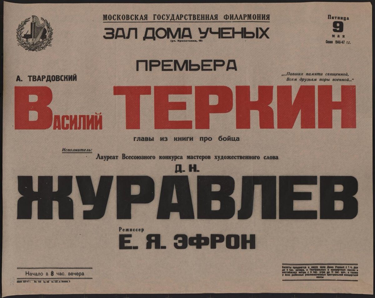 💬 Сегодня, в честь Дня рождения Александра Твардовского, хочу рассказать об афише исполнения поэмы «Василий Тёркин» «Василий Тёркин» — это уникальный лирический памятник военному времени. Его, в исполнении мастера художественного слова Дмитрия Николаевича Журавлева, услышали посетители Московской государственной филармонии 9 мая 1947 года. 🌟 Твардовский — не просто поэт, а человек-эпоха: литератор, военный корреспондент, участник Великой Отечественной войны, подполковник, главный редактор журнала «Новый мир». Его поэма «Василий Тёркин» в 1946 году была удостоена Сталинской премии первой степени — самой высокой награды для писателя в СССР. ⠀ Прикоснитесь к истории нашей страны и узнайте больше о поэтической и музыкальной атмосфере военных лет на выставке «Этот день мы приближали...». 📍Музей музыки (ул. Фадеева, 4) 🟤Выставка продлится до 5 октября 2025 года 🟤Билеты До встречи в музее!