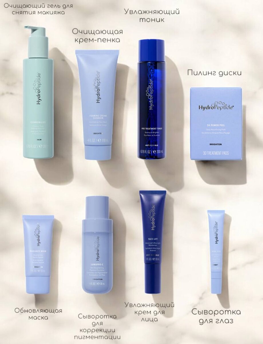 Подборка HydroPeptide для женщины 43 лет. Цель: выравнивание тона, улучшение цвета лица и осветление пигментации. 1. Cleansing Gel. Очищающий гель с эффектом тонизации кожи. 200 мл - 6570 руб 2. Foaming Cream Cleanser. Очищающая крем-пенка с уплотняющим и выравнивающим тон кожи действием. 118 мл - 6160 руб 3. Pre-Treatment Toner. Активизирующий тоник с мощным увлажняющим действием. 200 мл - 6100 руб 4. 5X Power Peel. Экстра-омолаживающий пилинг на основе специального обновляющего комплекса 5Х, пептидов и энзимов. 30 салфеток -9000 руб 5. Radiance Mask. Обновляющая маска с легким осветляющим действием для супер увлажнения и деликатного сияния кожи. 30 мл - 5670 руб 6. LumaPro-C. Омолаживающая сыворотка-корректор для интенсивной борьбы с пигментацией. 30 мл - 14400 руб 7. Face Lift. Ультралегкий увлажняющий крем с мощной антиоксидантной защитой. 30 мл - 11160 руб 8. Vital Eyes. Сыворотка для глаз мгновенного действия. 15 мл - 11340 руб Стоимость набора: 70400 руб