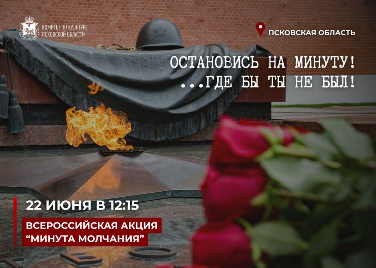 Всероссийская акция «Минута молчания» ⚡ 22 июня в 12:15 по московскому времени по всей России пройдет акция «Минута молчания» в память о героях Великой Отечественной войны. 🙏 В 12:14 необходимо прервать разговоры, отложить дела, встать, снять головные уборы и выключить звук на устройствах. Водителям рекомендуется остановиться и заглушить двигатели. 💙 В эту минуту прервется вещание на телевидении и радио, остановятся заводы — страна почтит память павших. 🕊️ Вечная слава героям! Вечная память павшим! 👉Подписывайтесь на ВЛуки.ру