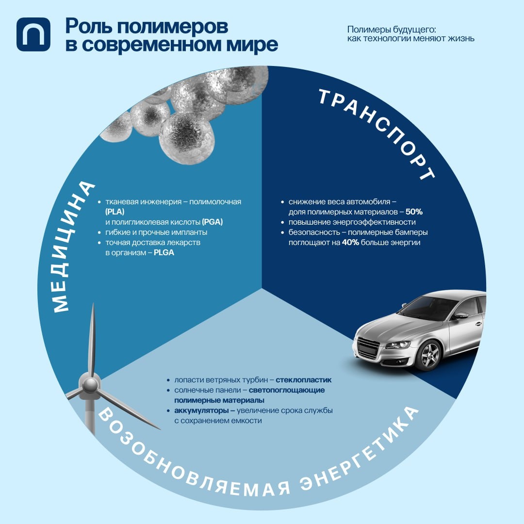 Полимеры — неотъемлемая часть современной технологической среды. Они позволяют создавать инновационные решения. Эти материалы спасают жизни и приближают нас к устойчивому будущему с безопасным транспортом и возобновляемой энергией.