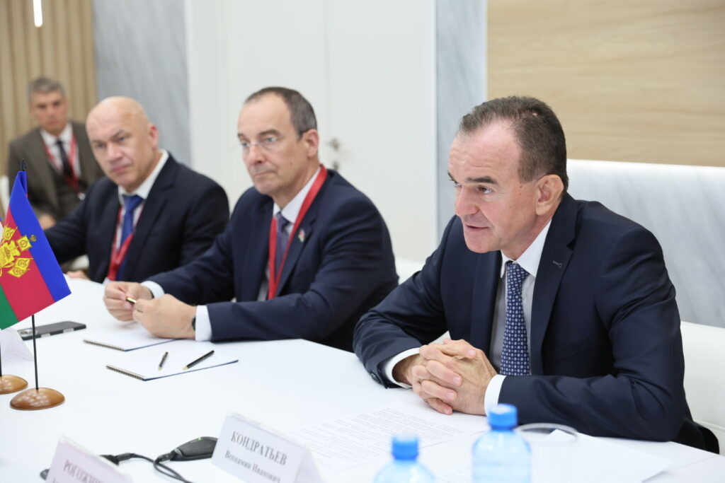 Губернатор Кубани в рамках Петербургского международного экономического форума провел встречу с Чрезвычайным и Полномочным Послом Республики Беларусь в Российской Федерации Александром Рогожником. Участие во встрече также приняли старший советник Посольства Республики Беларусь в РФ Денис Тимохин, председатель Законодательного собрания Краснодарского края Юрий Бурлачко, вице-губернатор Александр Руппель, статс-секретарь главы региона Максим Слюсарев. – Мы вместе работаем в интересах нашего региона и двух стран. Подводя итоги, намечаем, что еще можно сделать на благо жителей. Мы уже локализовали производство белорусских тракторов, ведем сборку комбайнов и жаток, вместе делаем шаги, чтобы эта техника была доступна аграриям. Максимально сохраняем и наращиваем товарооборот, создавая преференции для белорусской продукции. Эти товары доступны и популярны в том числе у миллионов наших отдыхающих. А то, что производится на Кубани, поставляем на рынки Беларуси. Таким образом формируем общее экон