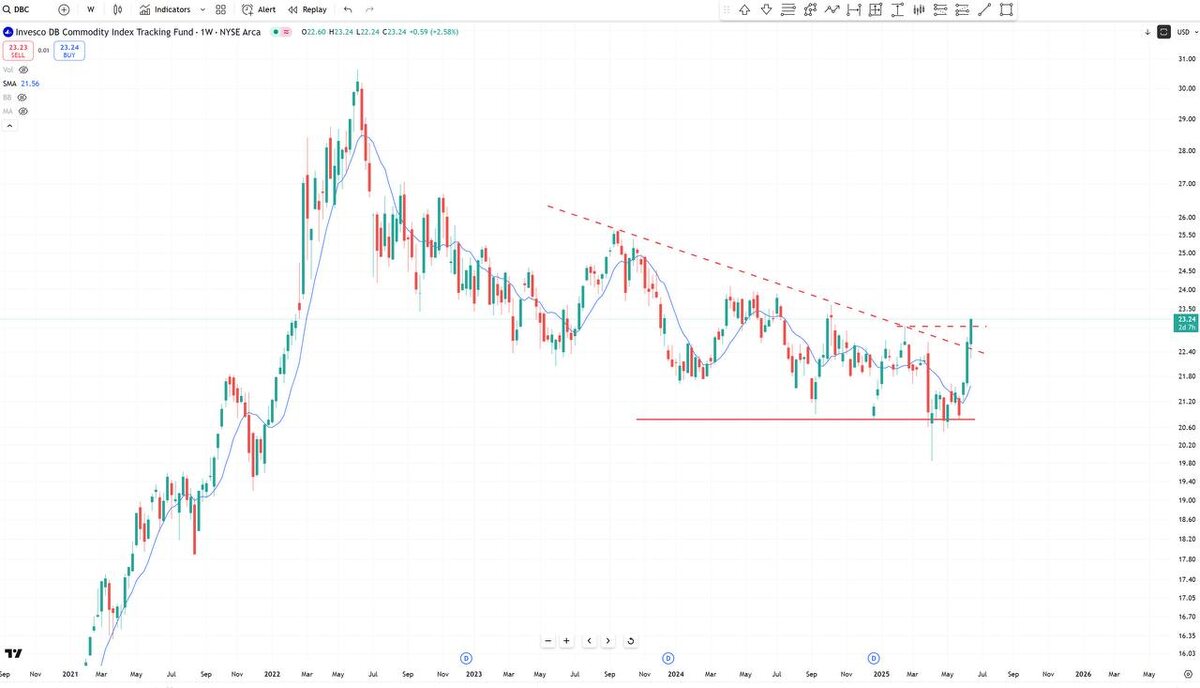 На графике выше — фонд $DBC (Invesco Commodity Index Fund), который отслеживает динамику сырьевых товаров: нефть, газ, металлы, сельхозпродукция.