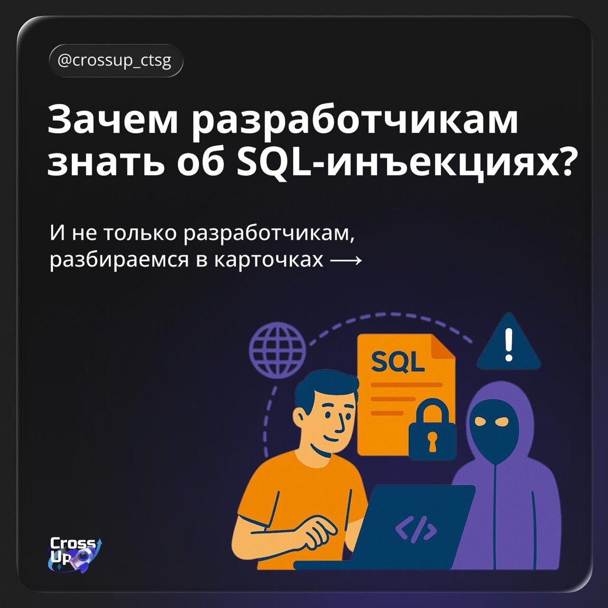 Как комарик укусит 😈 Если ты хоть раз писал запрос к базе, значит, SQL-инъекции могут стать твоей головной болью 😖 В карточках разобрали, как влияют такие уязвимости на разработку 👊 🌟 CrossUp | Подписывайся! #войтивайти