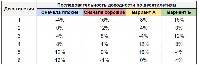 Математически, независимо от порядка, итоговая доходность за 60 лет будет одинаковой (примерно 5,7% годовых). Но вот парадокс: если вы инвестируете постепенно (а не вкладываете всю сумму разом), последовательность доходности становится критичной.
