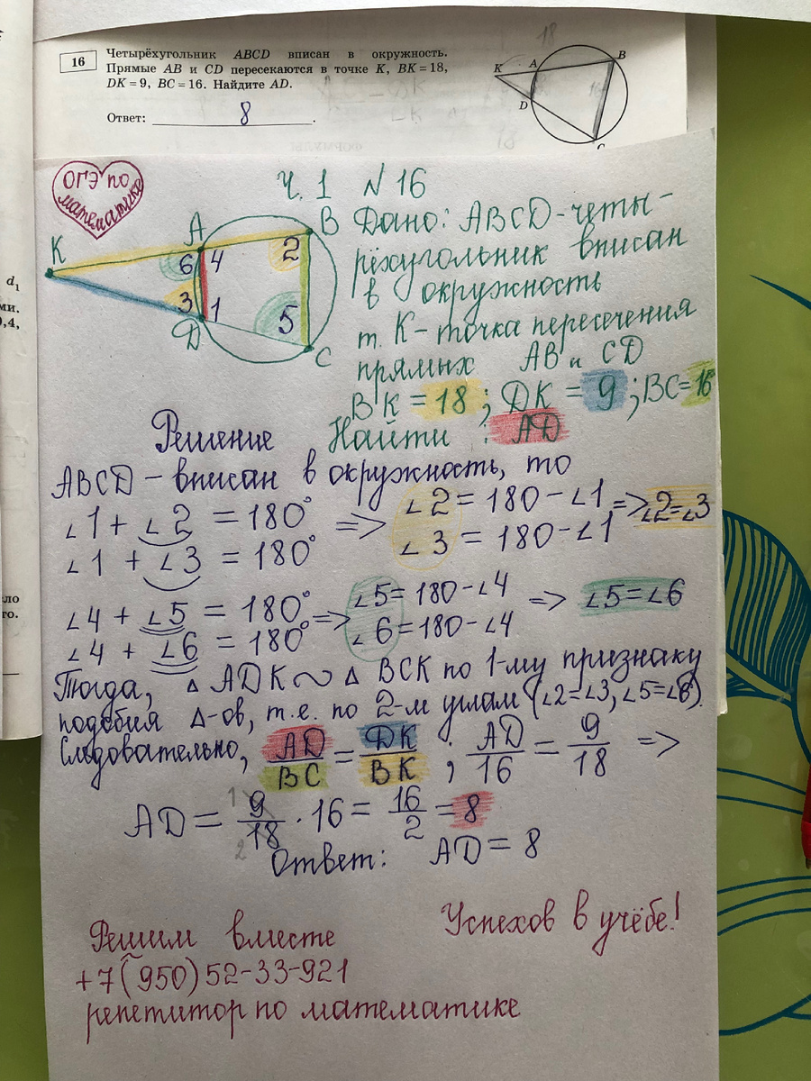 ОГЭ по математике: найти АД четырехугольника АВСД, вписанного в окружность (ч. 1 номер 16)