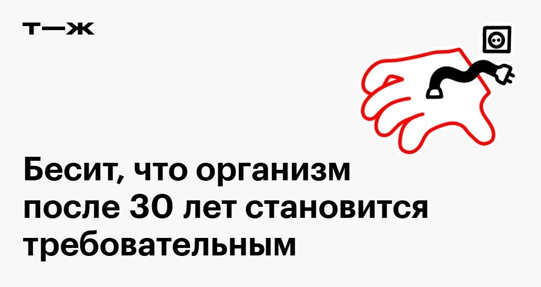 В 20 лет ты просыпаешься в 06:30 на диванчике длиной 1,4 м в кофейне со светом и играющей музыкой. Ты уснул там после ночной попойки в баре, а через полчаса уже выпил кофе, почистил зубы и выходишь на смену. Тебе нормально, и ты можешь работать. После 30 ты спишь дома на ортопедическом матрасе и все равно, если не открыл окно или не заправил увлажнитель, просыпаешься с ощущением, будто тебя каток переехал. Тридцатилетние, общий сбор на наш ежегодный кружок жалоб на здоровье — в комментариях: https://t-j.ru/z-tg/organizm-posle-30-hate