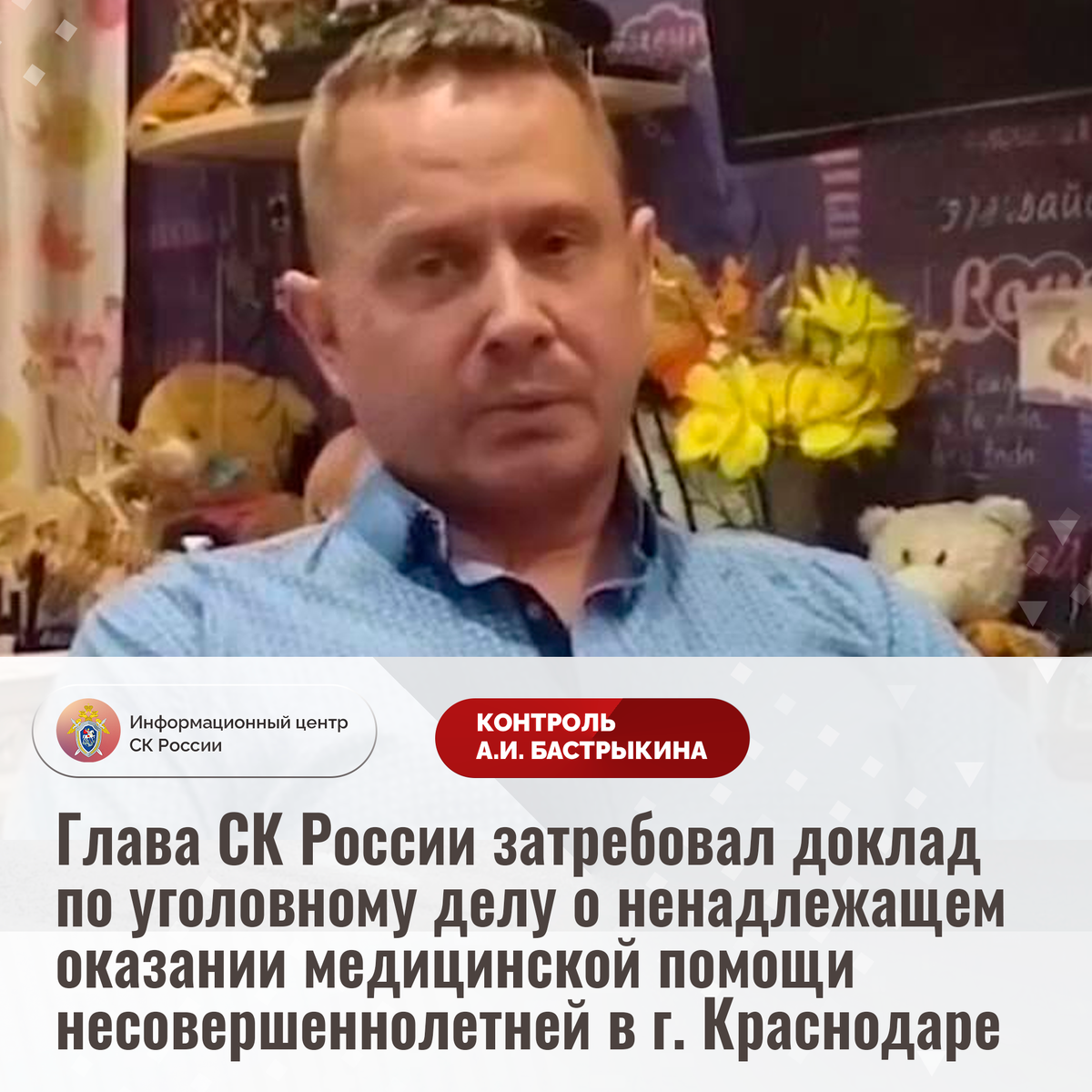 Глава СК России затребовал доклад по уголовному делу о ненадлежащем оказании медицинской помощи несовершеннолетней в г. Краснодаре