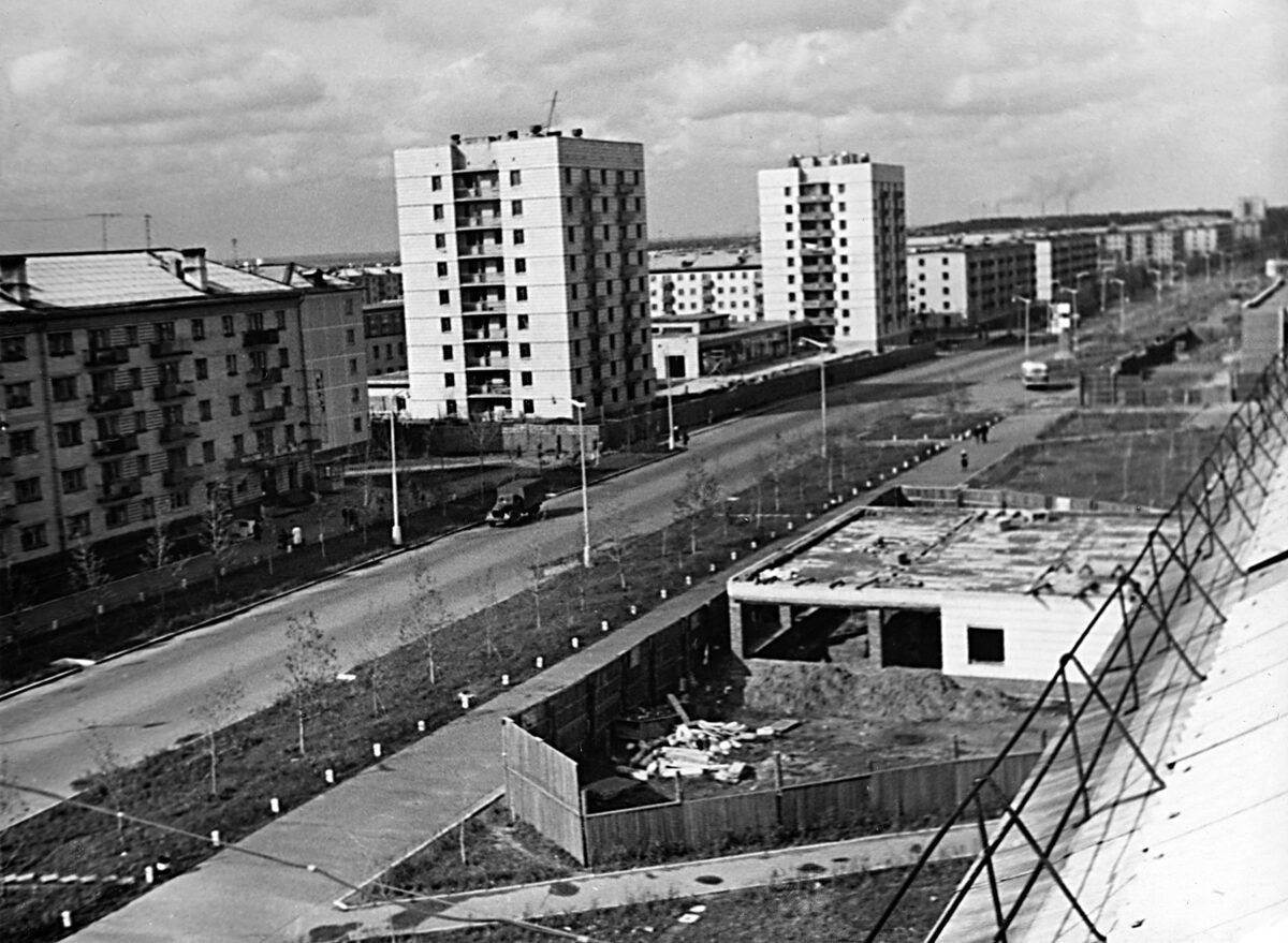 70-е..Коммунистический проспект во времена празднования 50 Октябрьской революции. Еще нет "Шашлычной", строиться "Малыш", достраиваются Коммуна-70,74. Огороженные стройплощадки.