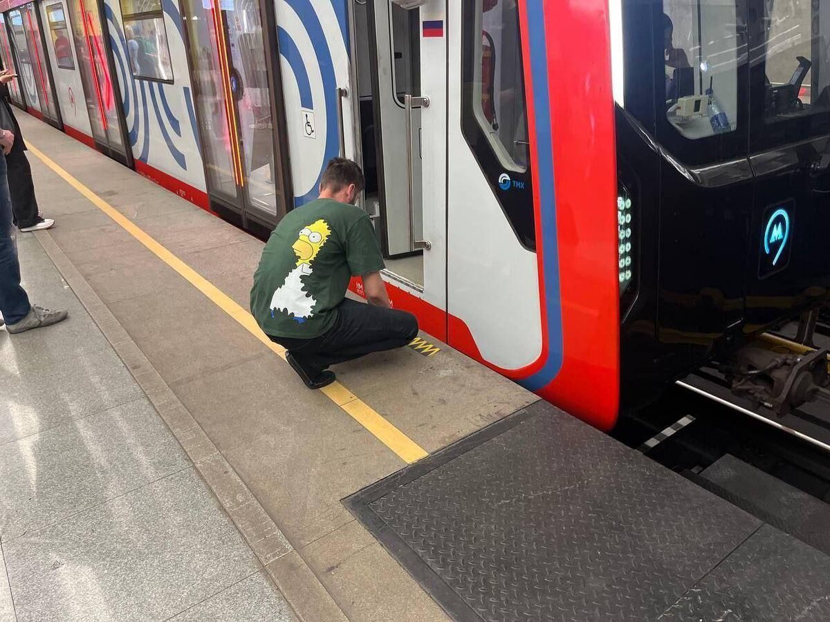 Сотрудники выходят и измеряют точность остановки состава по двери машиниста.